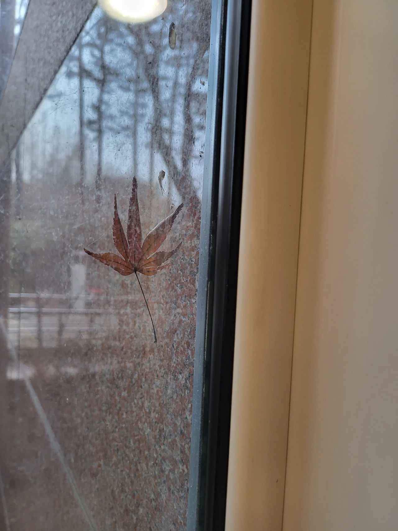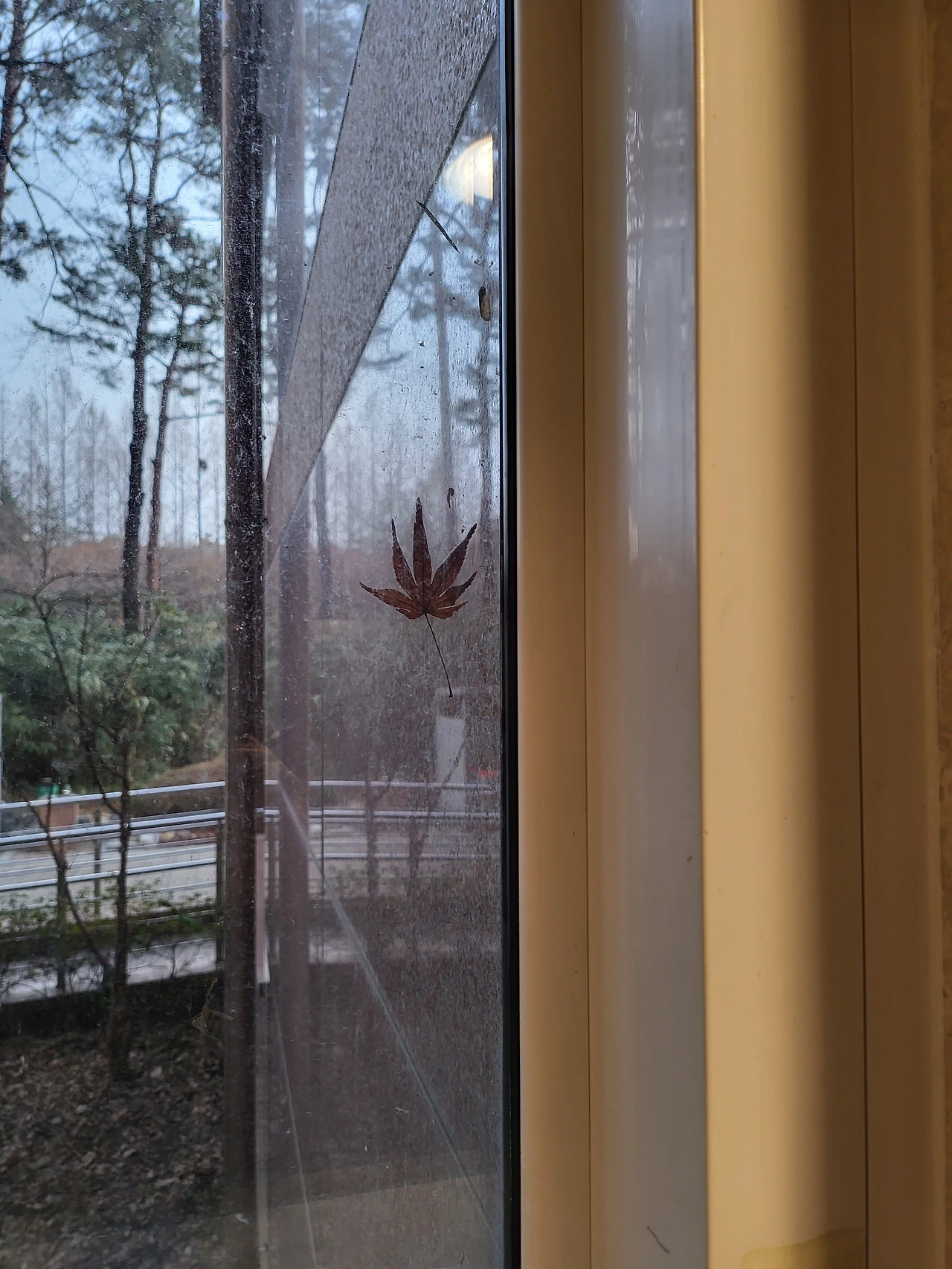 1층 엘리베이터 옆 창에서 바라본 단풍잎.