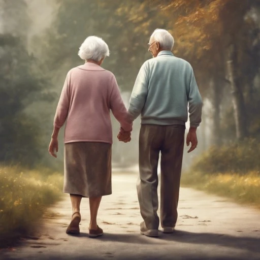 첫번째로 산책로에서 손을 잡고 걷는 노부부.