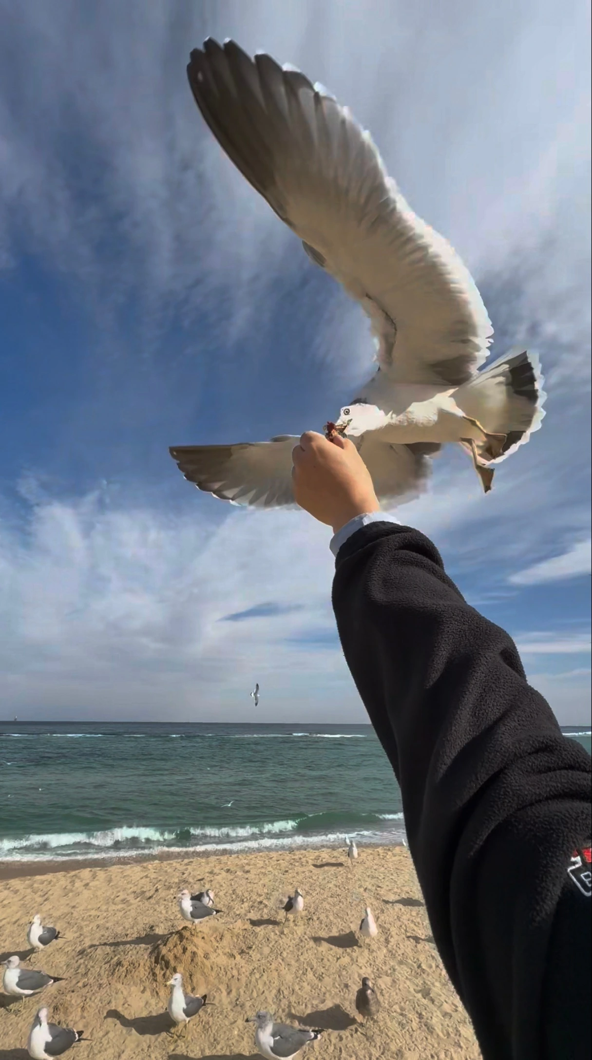 갈매기에게 먹이를 주자 힘차게 날아와 받아먹는 순간을 동영상으로 담았는데, 그 장면을 캡처하니 놀랍게도 한 폭의 작품 사진이 되었습니다.