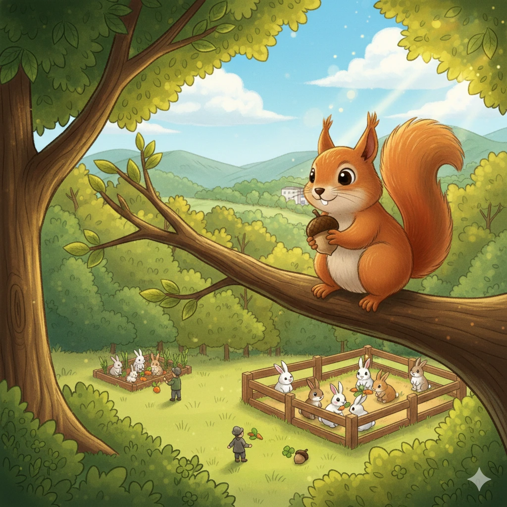 "와, 토끼들은 정말 좋겠다. 관리인 아저씨가 맛있는 채소도 매일 가져다주고, 비바람을 피할 튼튼한 집도 있잖아? 나는 도토리를 찾으러 온종일 뛰어다녀야 하는데 말이야."