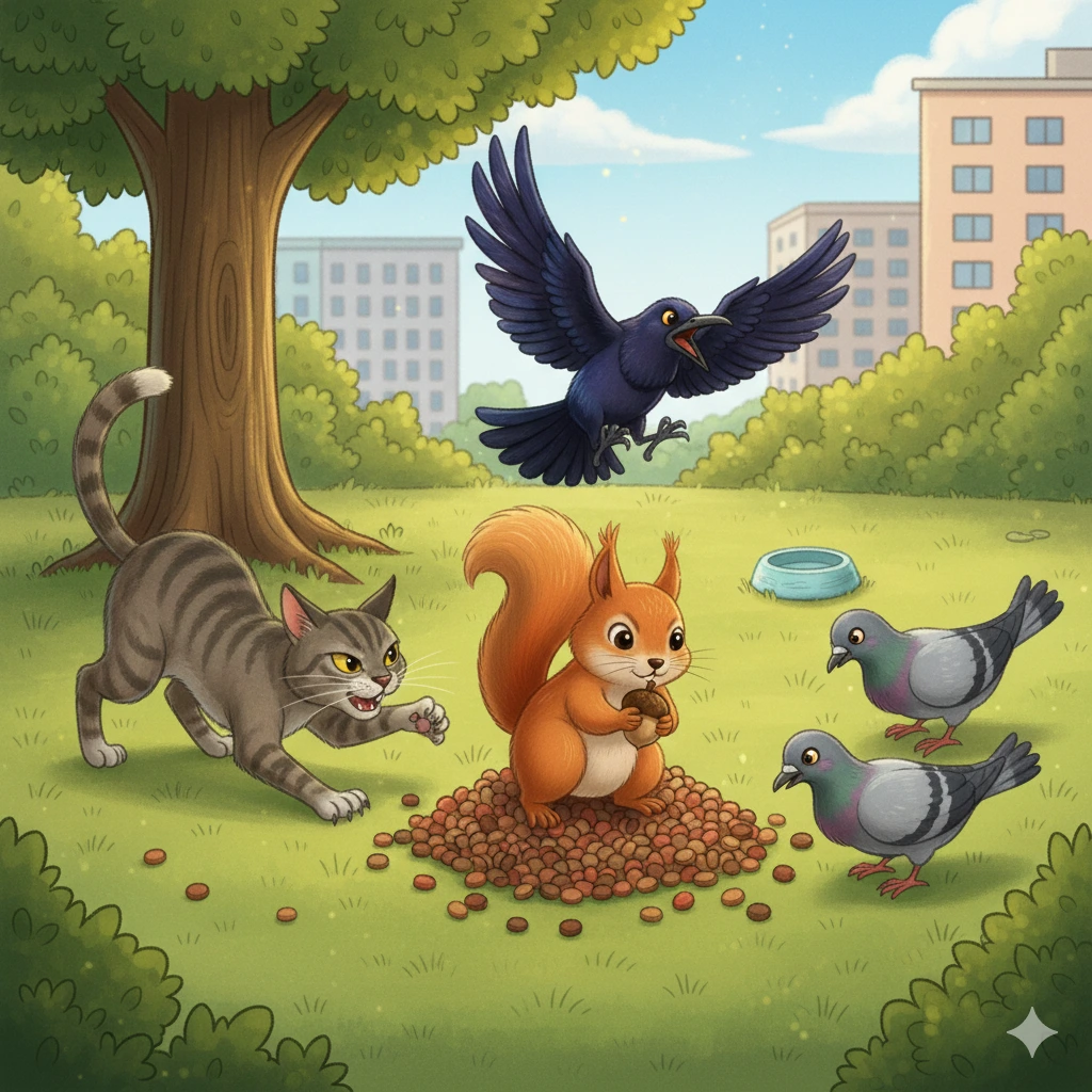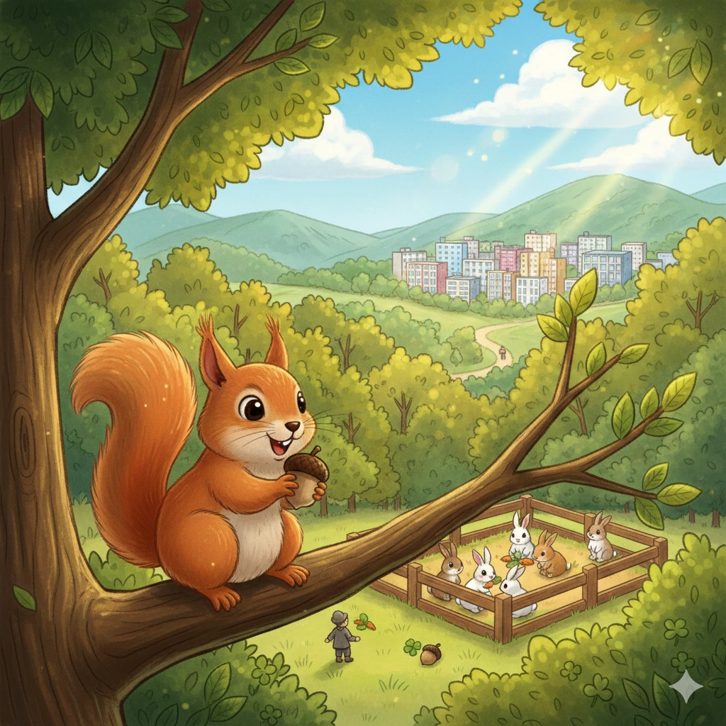 삐뽀는 다시 가로수를 타고 힘차게 달렸어요. 공원에 도착해 익숙한 흙냄새와 나무 향기를 맡으니 가슴이 벅차올랐죠. 이제 삐뽀는 더 이상 토끼를 부러워하지 않아요. 대신 세상에서 가장 행복한 표정으로 도토리를 찾으며 친구들에게 말했답니다.