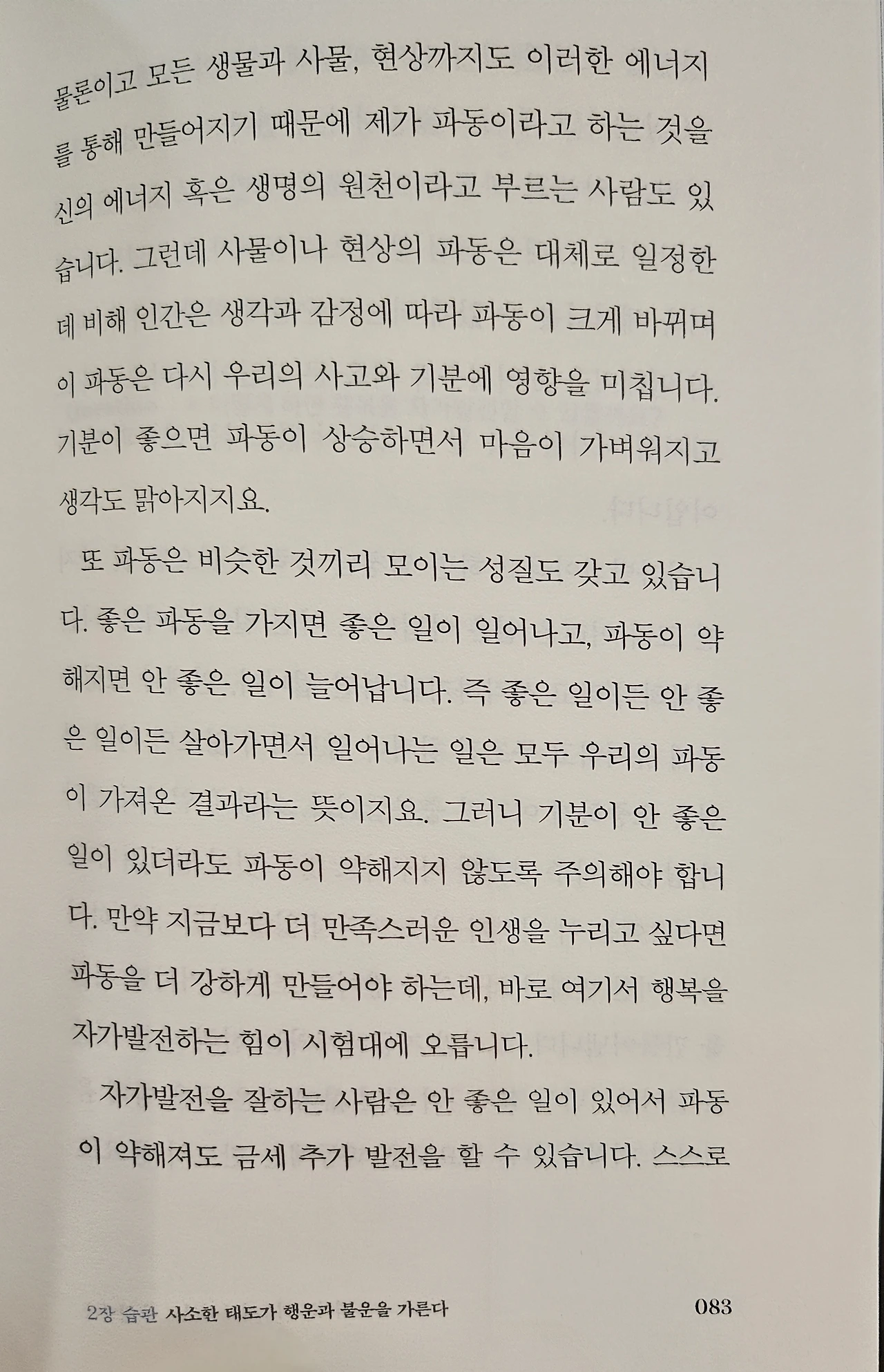 책에서는 이를 ‘파동’이라 표현했지만, 나는 그것을 ‘에너지’라고 불러도 무방하다고 느낀다. 스스로 좋은 에너지를 지니고 있으면, 결국 비슷한 결의 좋은 에너지가 자연스럽게 끌려오게 마련이다.