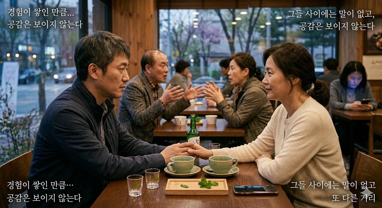 카페 한켠, 옆 테이블에 앉은 두 부부의 이야기가 들려온다.