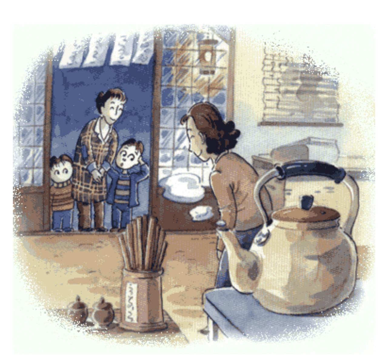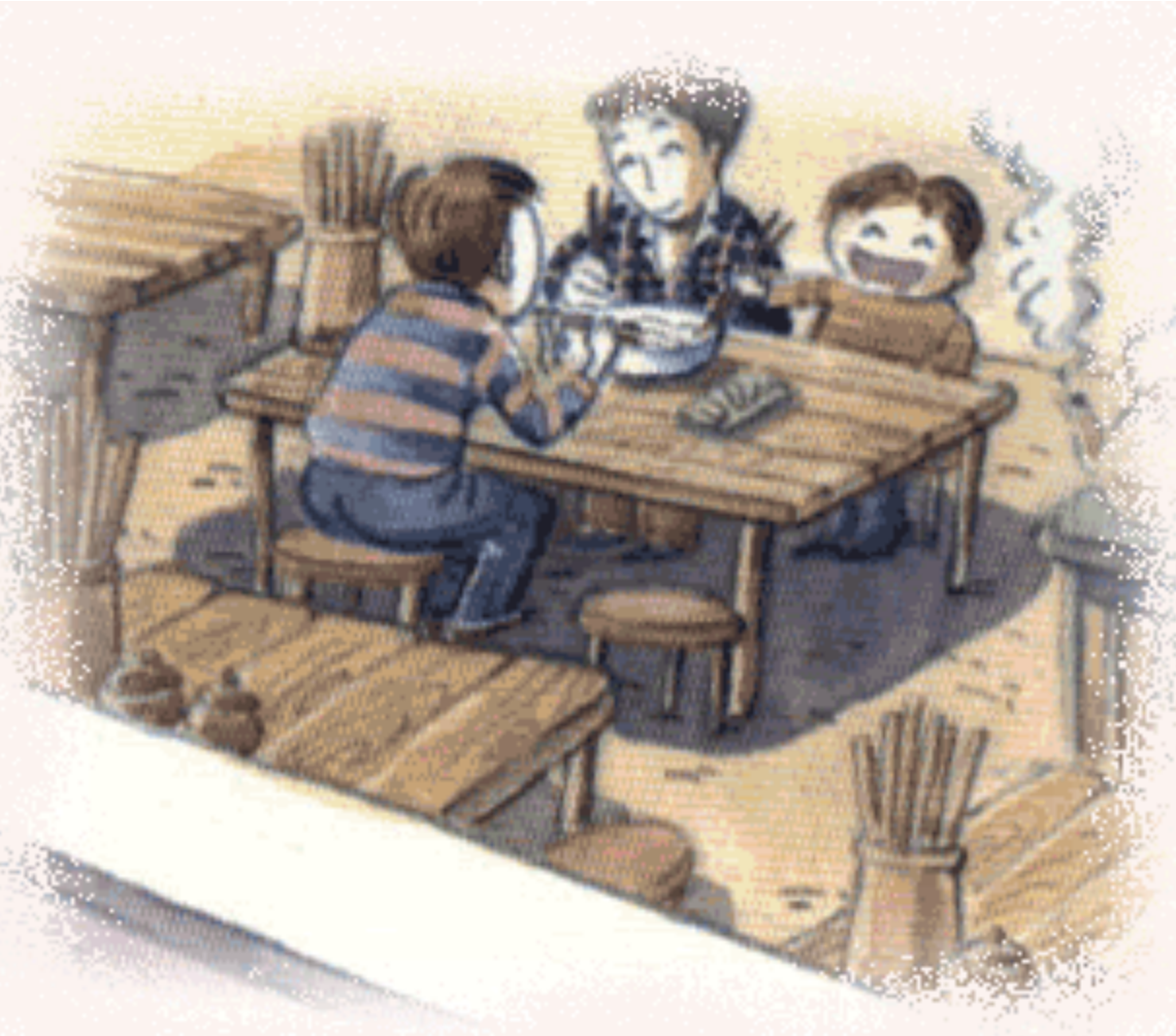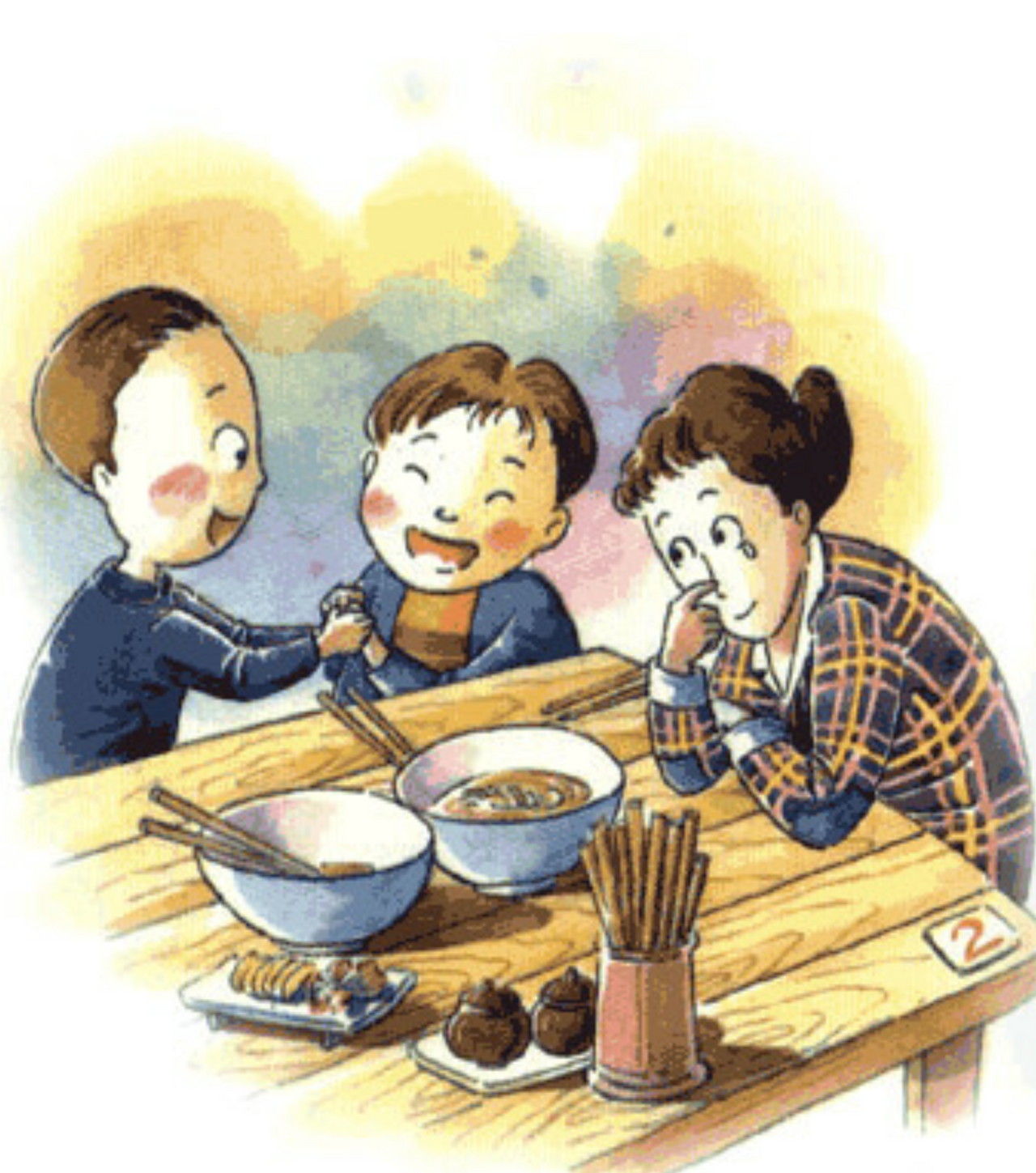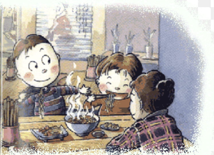 동생은 젓가락으로 국수를 한 가닥 집어서 어머니의 입으로 가져갔습니다. 비록 한 그릇의 우동이지만 세 식구는 맛있게 나누어 먹었습니다.