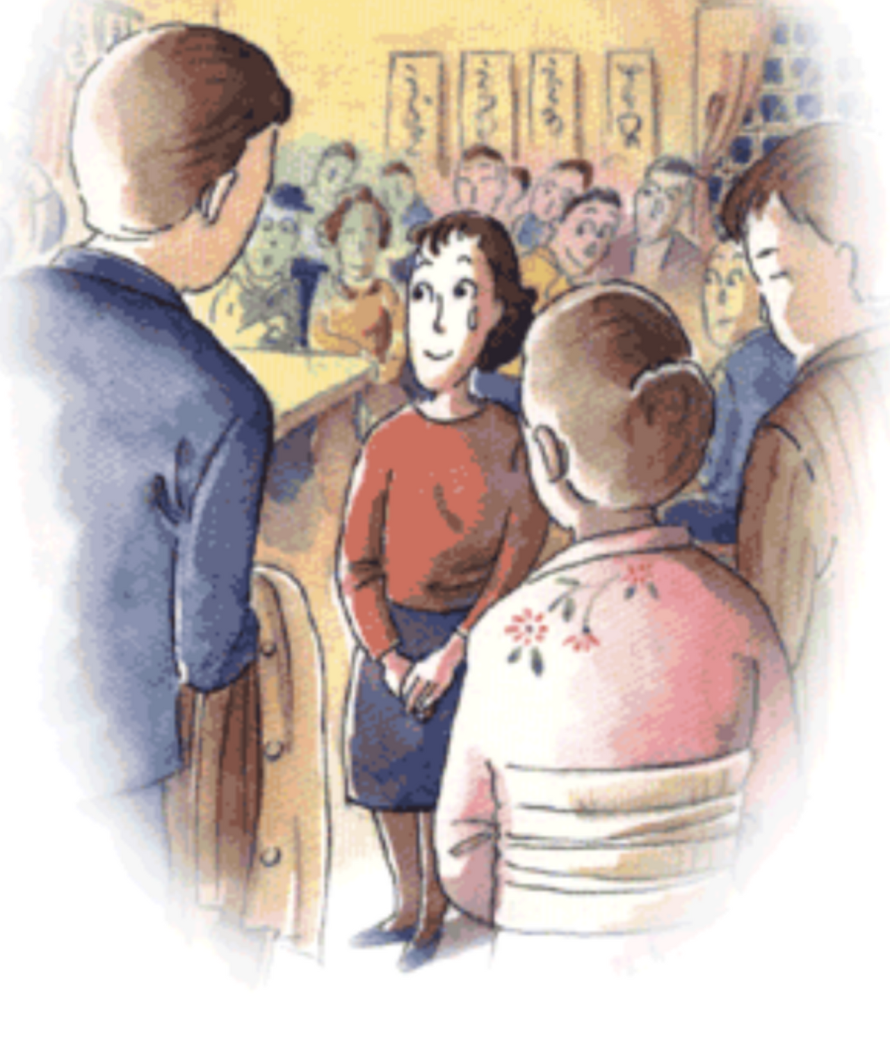 그리고 남편과는 달리 상냥해서 손님들에게 인기가 많은 주인여자는, 임시로 고용한 여종업원에게 특별 보너스와 국수가 담긴 상자를 선물로 주어 보내는 중이었습니다.