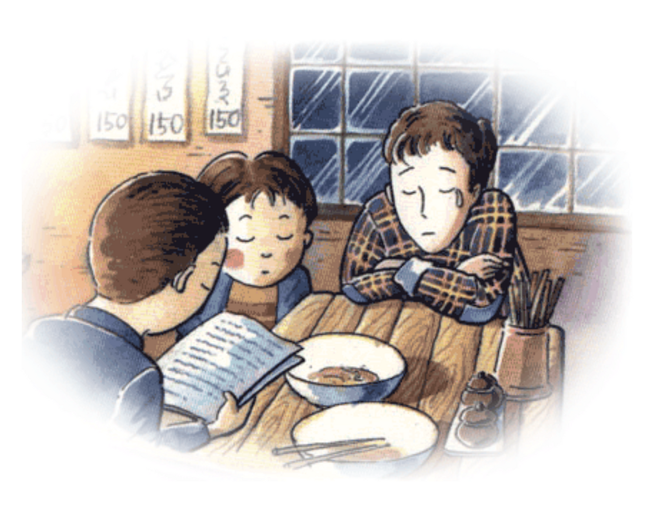 그 때의 한 그릇의 우동에 용기를 얻어 세 사람이 손을 맞잡고 열심히 살아갈 수가 있었습니다.