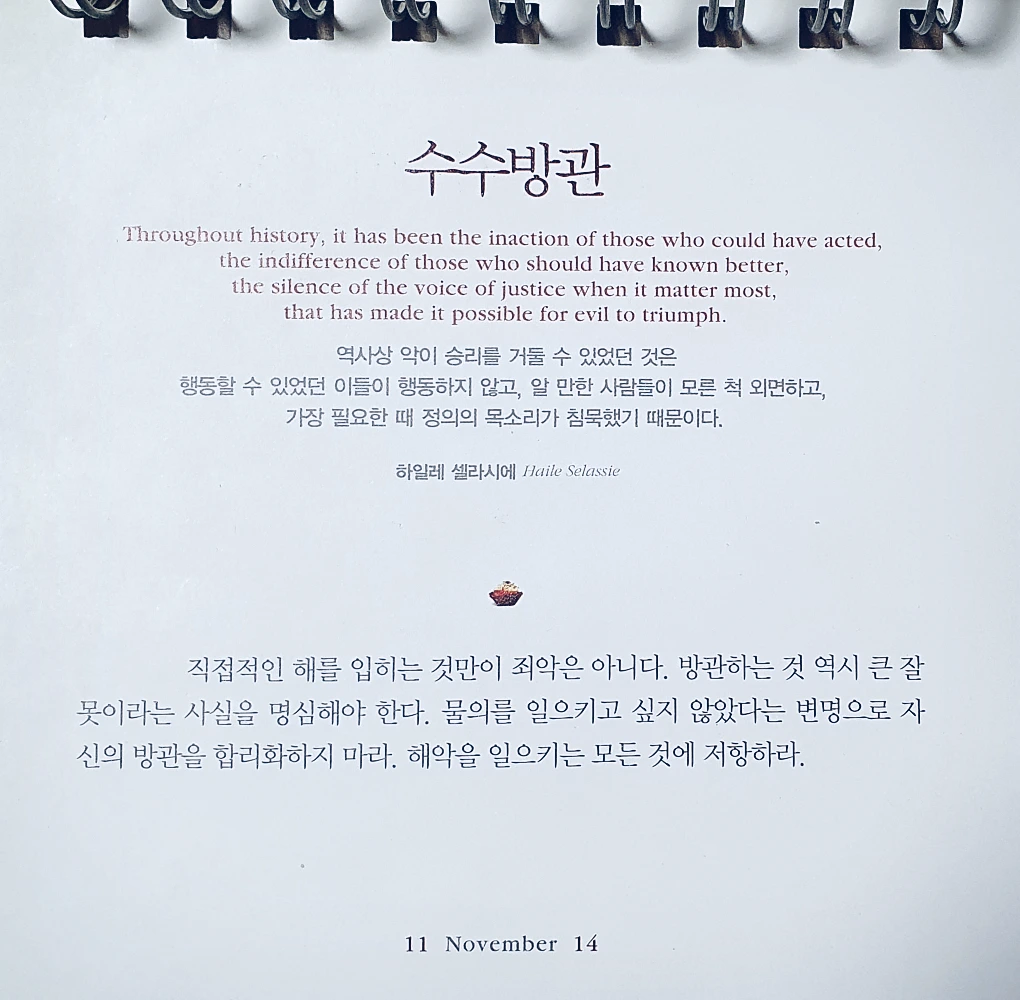 역사상 악이 승리를 거둘 수 있었던 것은 행동할 수 있었던 이들이 행동하지 않고, 알 만한 사람들이 모른 척 외면하고, 가장 필요한 때 정의의 목소리가 침묵했기 때문이다.