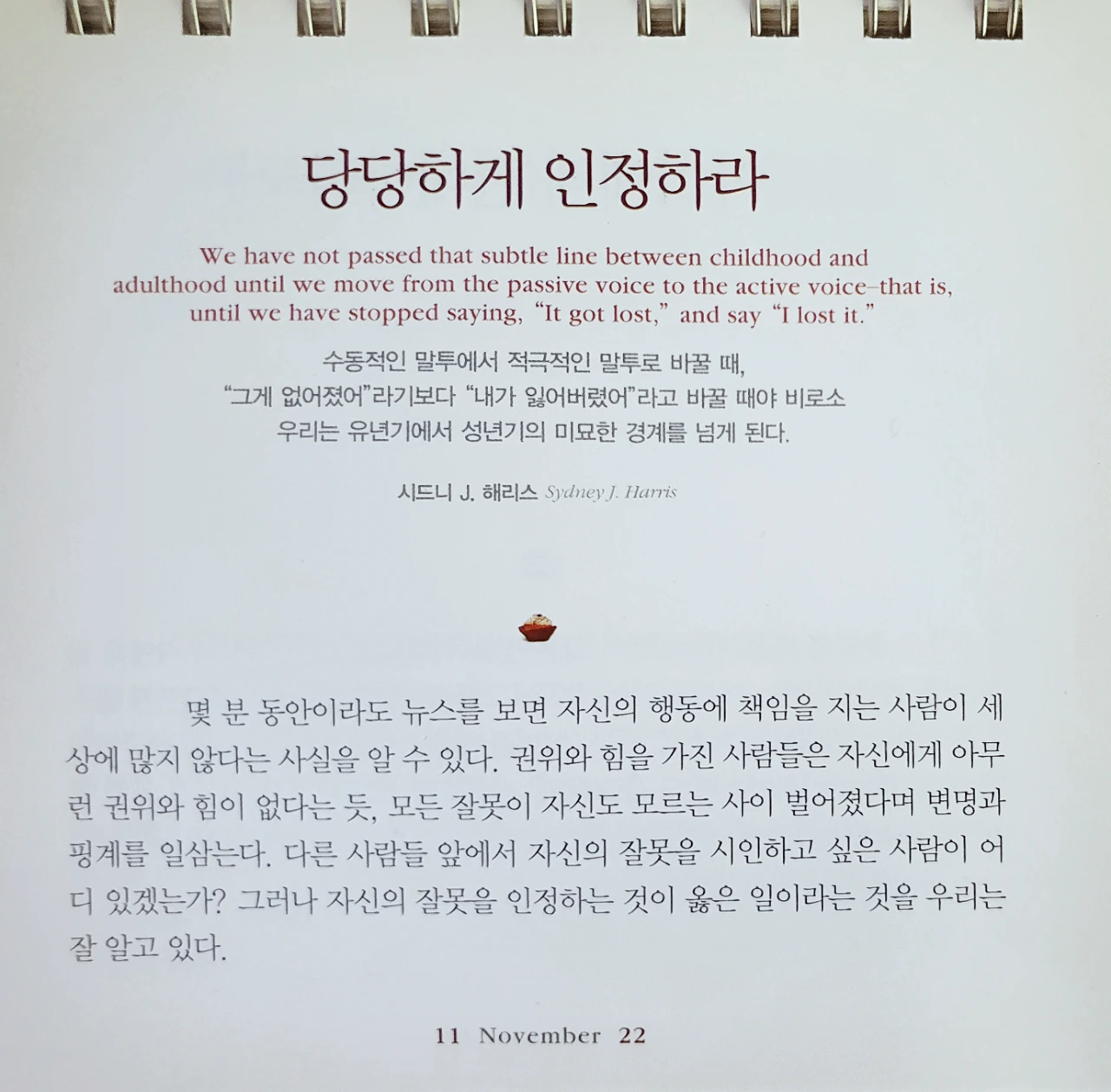 수동적인 말투에서 적극적인 말투로 바꿀 때, "그게 없어졌어"라기보다 "내가 잃어버렸어"라고 바꿀 때야 비로소 우리는 유년기에서 성년기의 미묘한 경계를 넘게 된다.