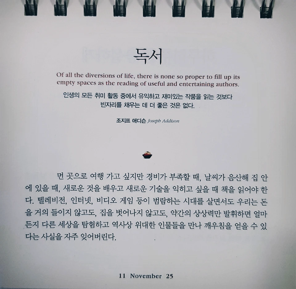 독서같이 값싸게 주어지는 영속적인 쾌락은 또 없다.