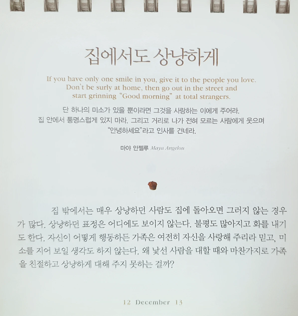 단 하나의 미소가 있을 뿐이라면 그것을 사랑하는 이에게 주어라. 집 안에서 퉁명스럽게 있지 마라. 그리고 거리로 나가 전혀 모르는 사람에게 웃으며 "안녕하세요"라고 인사를 건네라.