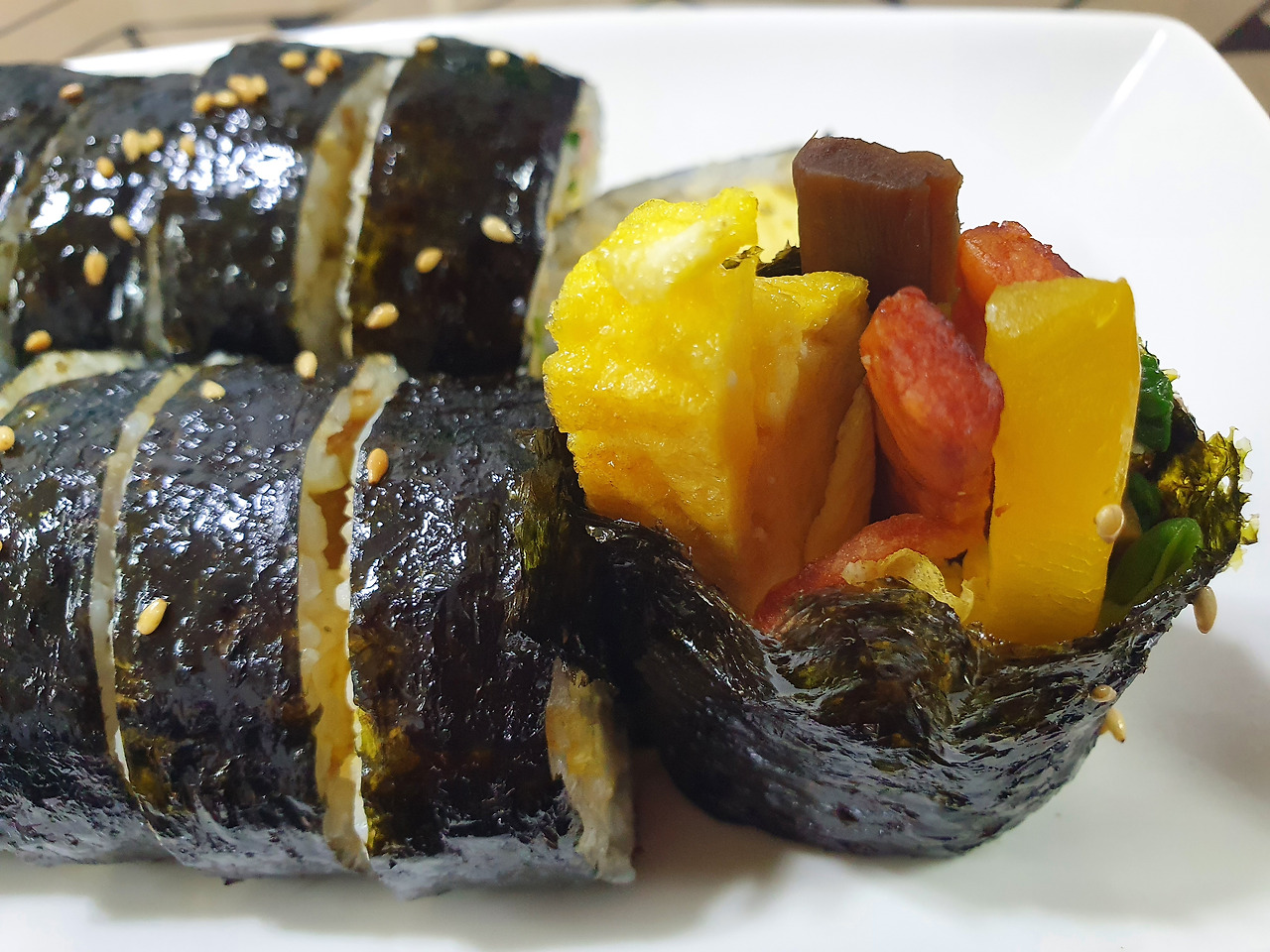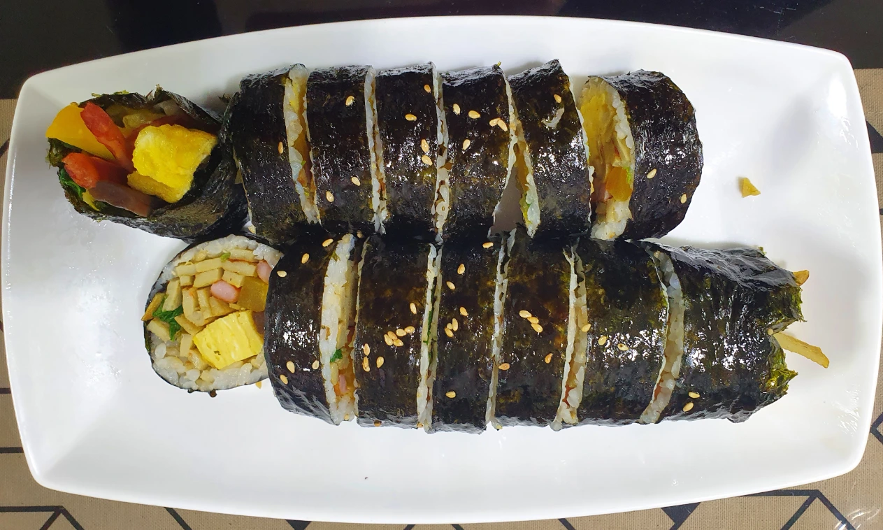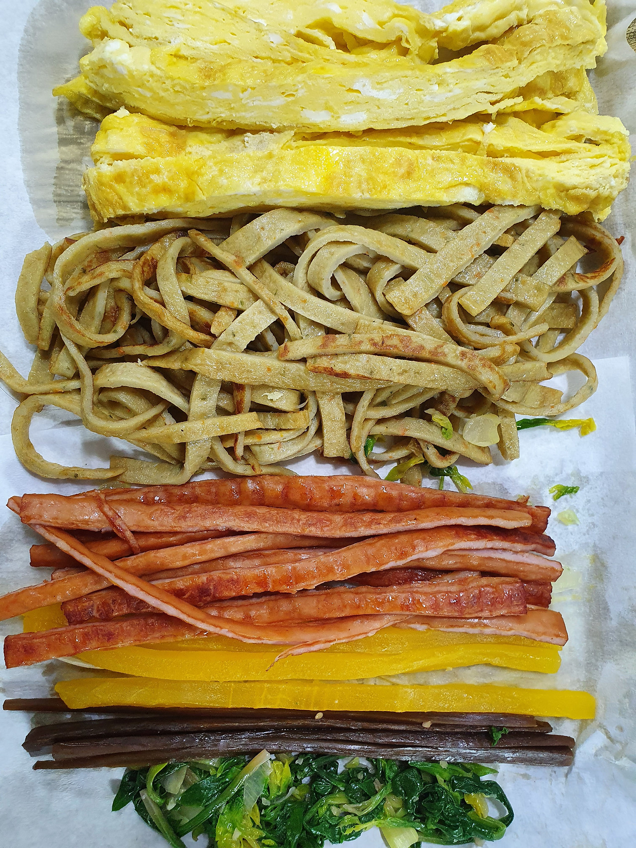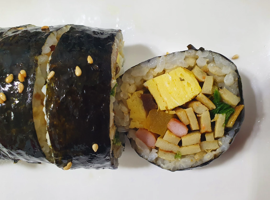 재료김밥용 김밥 1 공기계란납작오뎅단무지우엉ㅡ선택햄ㅡ 선택시금치ㅡ선택소금, 참기름, 깨