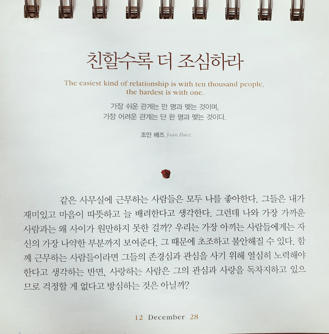 가장 쉬운 관계는 만 명과 맺는 것이며, 가장 어려운 관계는 단 한 명과 맺는 것이다. ㅡ조안 배즈 Joan Baezㅡ