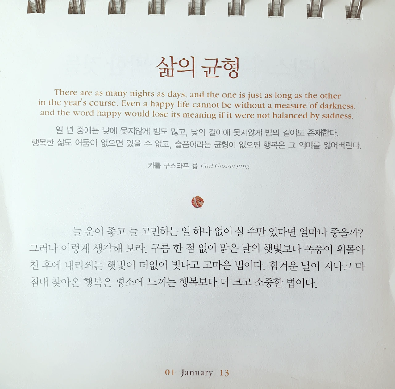 일 년 중에는 낮에 못지않게 밤도 많고, 낮의 길이에 못지않게 밤의 길이도 존재한다. 행복한 삶도 어둠이 없으면 있을 수 없고, 슬픔이라는 균형이 없으면 행복은 그 의미를 잃어버린다.