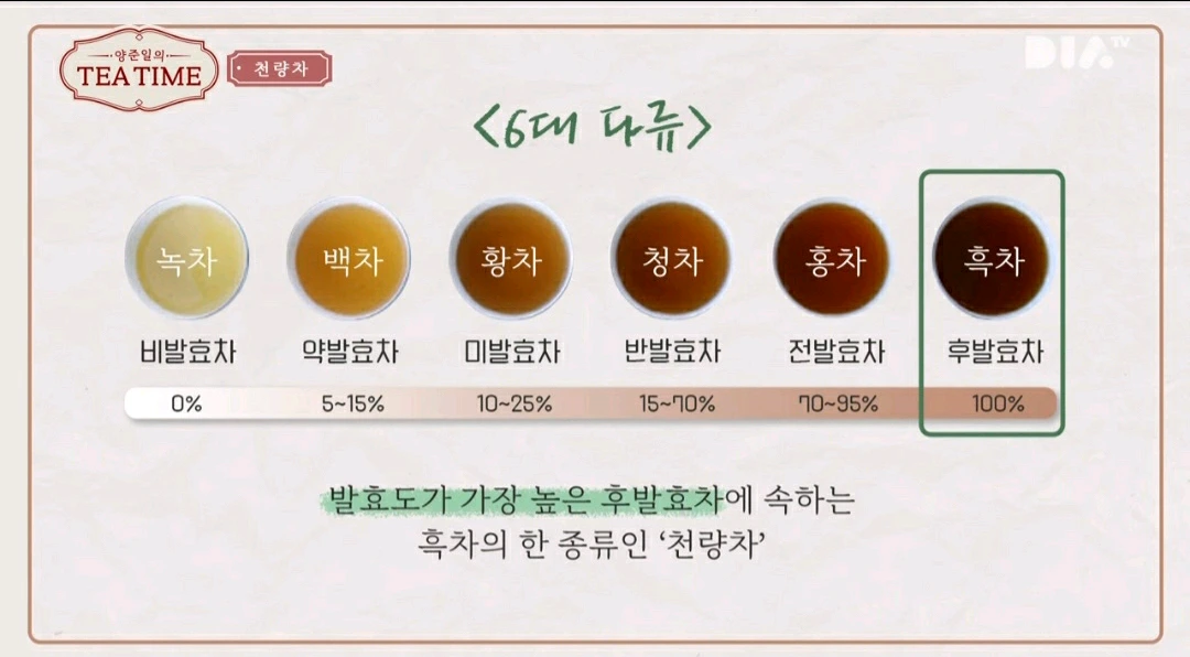 천량차는 6대 다류중에 가장 높은 '후 발효차'에 속하는 흑차의 한 종류라서 적어도 10년 이상은 발효돼야 마실 수 있다고 한다.