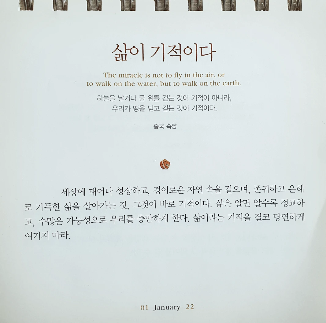 삶이 기적이다The miracle is not to fly in the air, or to walk on the water, but to walk on the earth.하늘을 날거나 물 위를 걷는 것이 기적이 아니라, 우리가 땅을 딛고 걷는 것이 기적이다.ㅡ중국 속담ㅡ