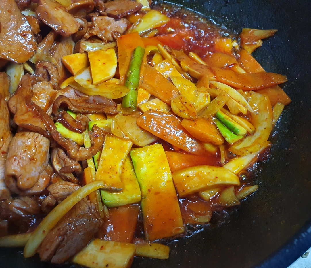 재료훈제오리ㅡ500g양파ㅡ반개호박ㅡ반개송이버섯깻잎부추-한줌대파, 편 마늘고추장ㅡ1큰술고춧가루ㅡ2큰술진간장ㅡ2큰술맛술-1큰술참기름, 소금, 후춧가루ㅡ취향대로 *설탕1큰술ㅡ선택