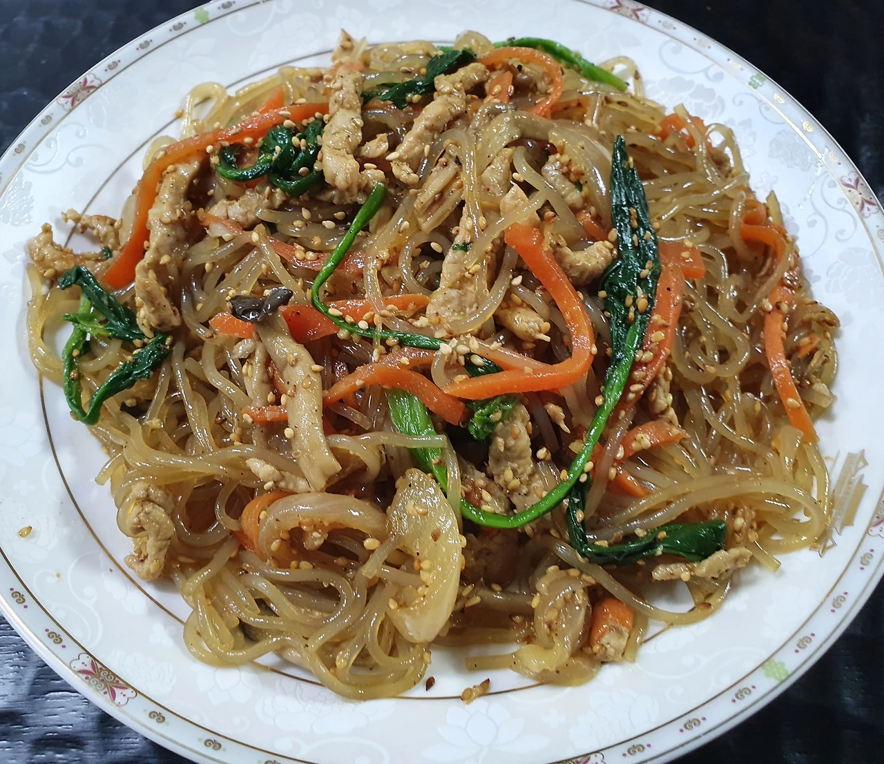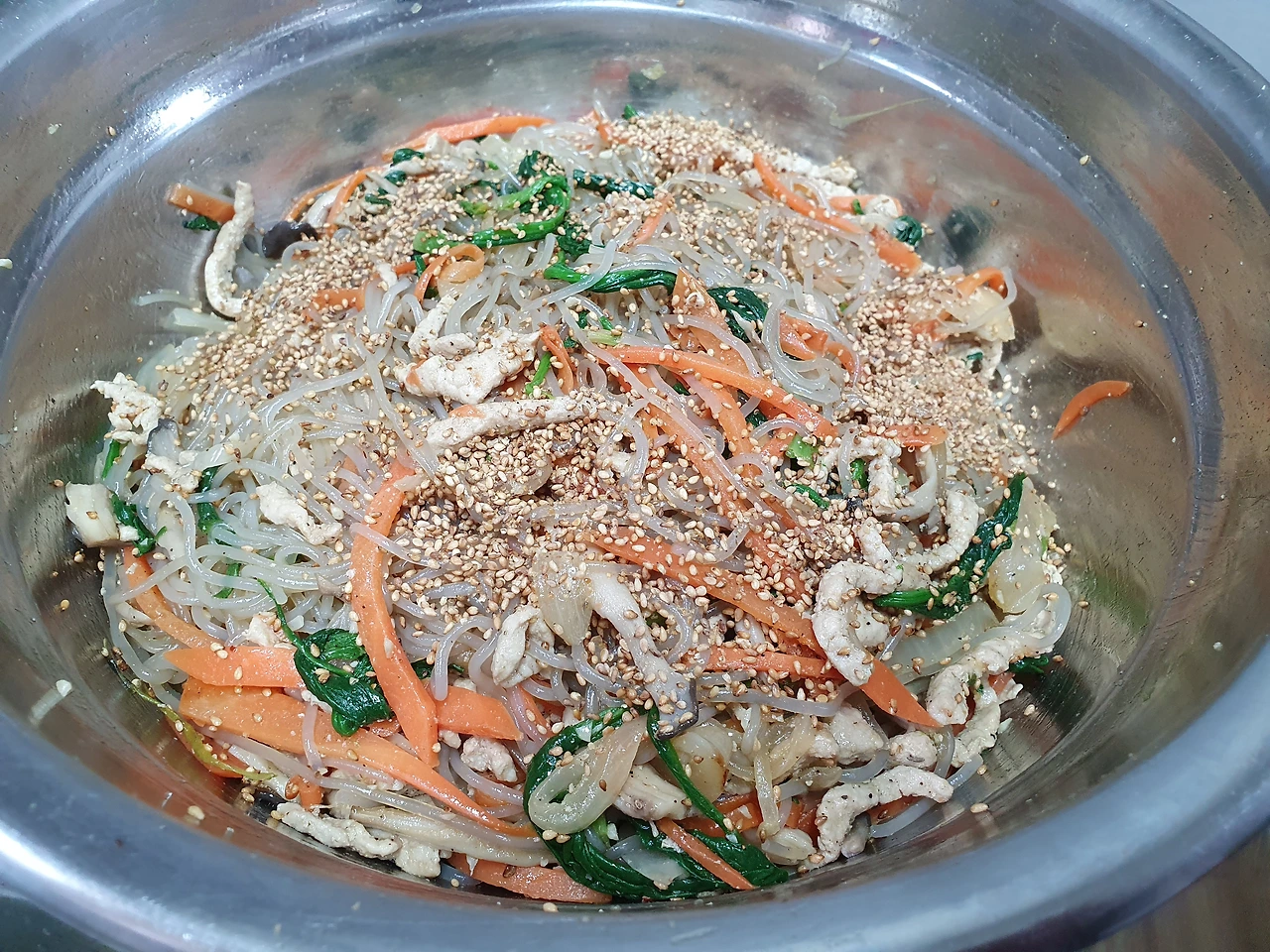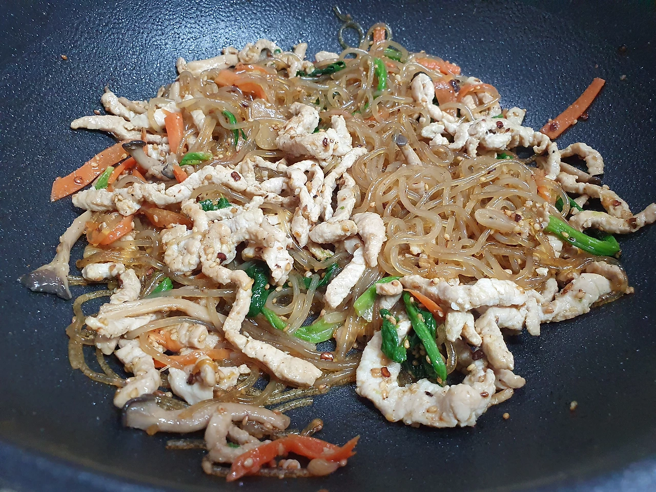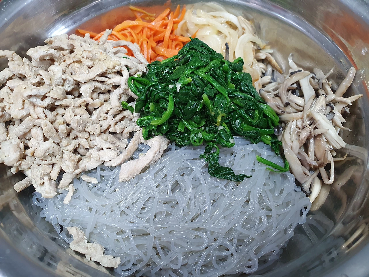 재료 당면-300g 돼지고기 잡채용ㅡ300g 시금치ㅡ한단 당근ㅡ반 개 양파ㅡ한 개 느타리버섯 ㅡ한팩 올리브유 식용유(포도씨유) 다진 마늘ㅡ두 큰 술 참기름ㅡ다섯 큰 술 진간장ㅡ여섯 큰 술 설탕ㅡ두 큰 술:선택 소금, 후춧가루, 깨