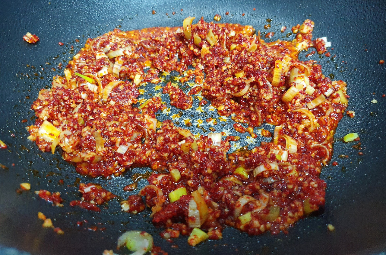 달군 팬에 고추기름 낼 재료를 볶는다.