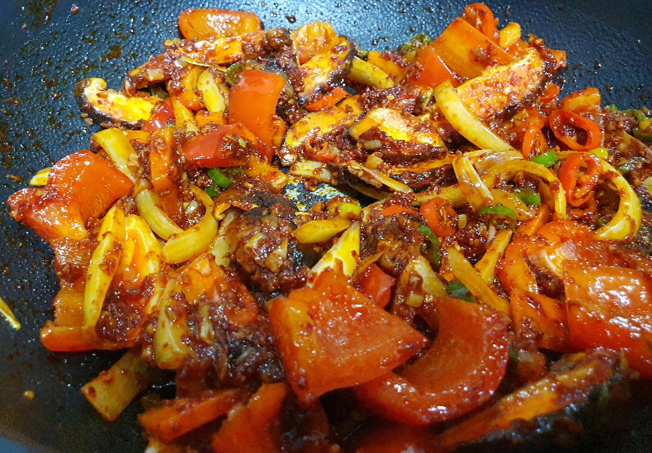 따로 볶은 야채를 볶아놓은 고추기름 재료에 더해서...