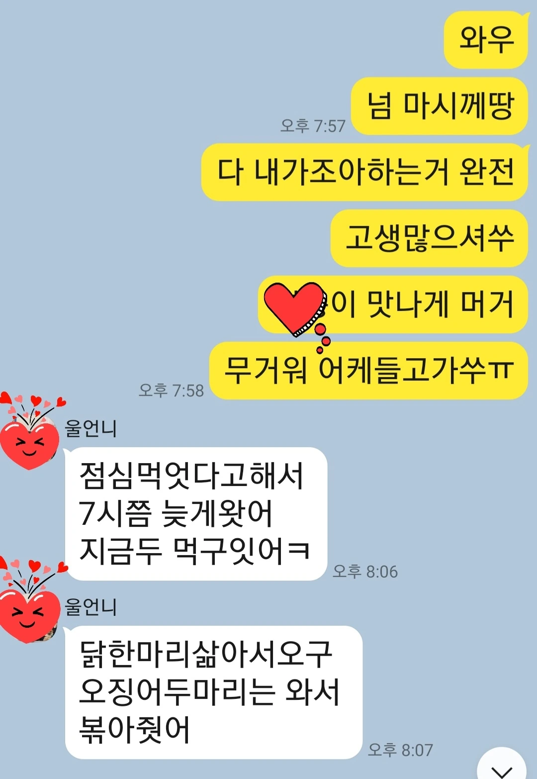 언니도 이제 나이를 먹으니 어깨가 아파 옷을 갈아입기 힘들 정도로 아프다면서 기어코 남동생이 좋아하는 오징어 볶음을 해주고 왔단다. 코로나로 쉬니 언제나 해 주겠냐면서 ㅠㅠㅠ