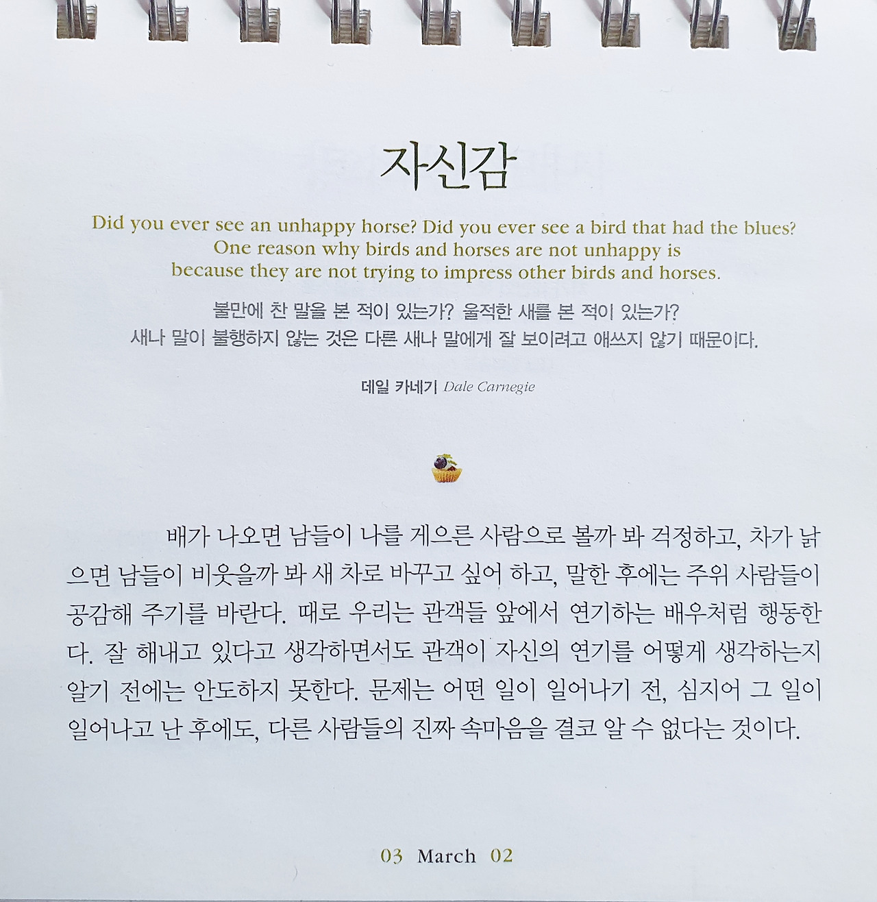 불만에 찬 말을 본 적이 있는가? 울적한 새를 본 적이 있는가? 새나 말이 불행하지 않는 것은 다른 새나 말에게 잘 보이려고 애쓰지 않기 때문이다. ㅡ데일 카네기 Dale Carnegieㅡ