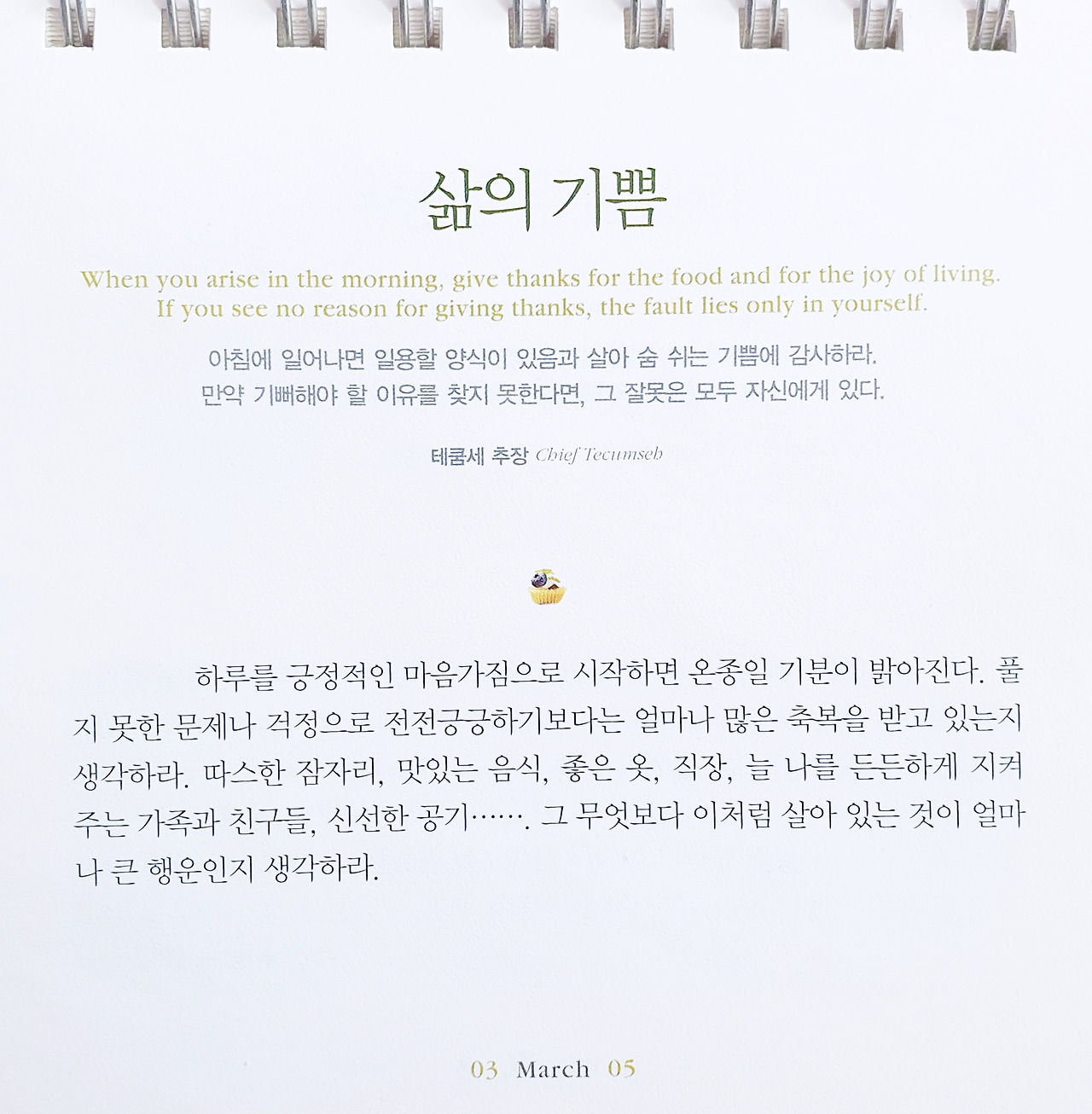 아침에 일어나면 일용할 양식이 있음과 살아 숨 쉬는 기쁨에 감사하라. 만약 기뻐해야 할 이유를 찾지 못한다면, 그 잘못은 모두 자신에게 있다. ㅡ테쿰세 추장 Chief Tecumsehㅡ