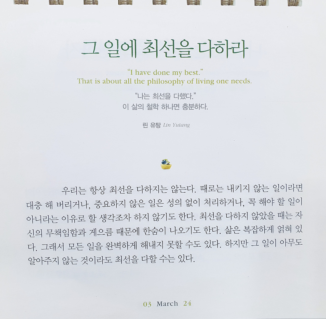 그 일에 최선을 다하라"I have done my best."That is about all the philosophy of living one needs."나는 최선을 다했다."이 삶의 철학 하나면 충분하다.ㅡ린 유탕 Lin Yutangㅡ