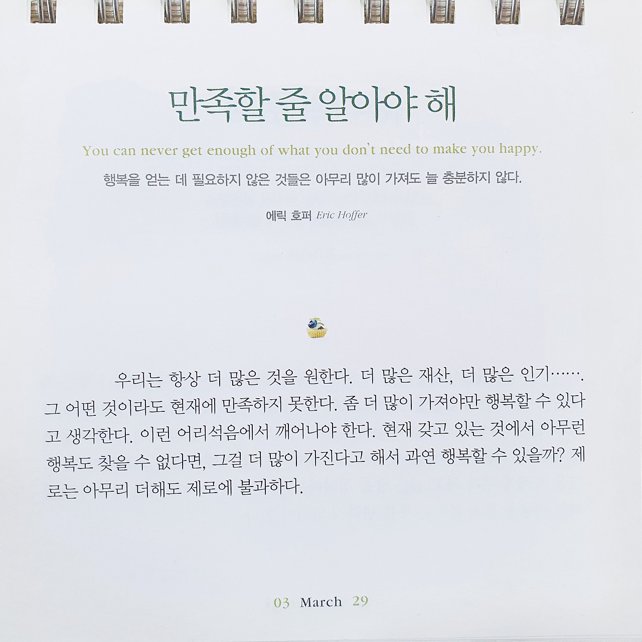 만족할 줄 알아야 해You can never get enough of what you don't need to make you happy.행복을 얻는 데 필요하지 않은 것들은 아무리 많이 가져도 늘 충분하지 않다.ㅡ에릭 호퍼 Eric Hofferㅡ