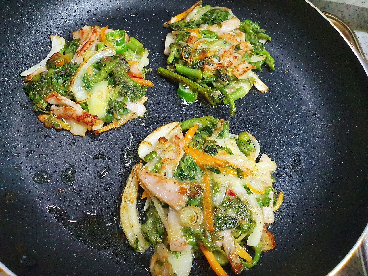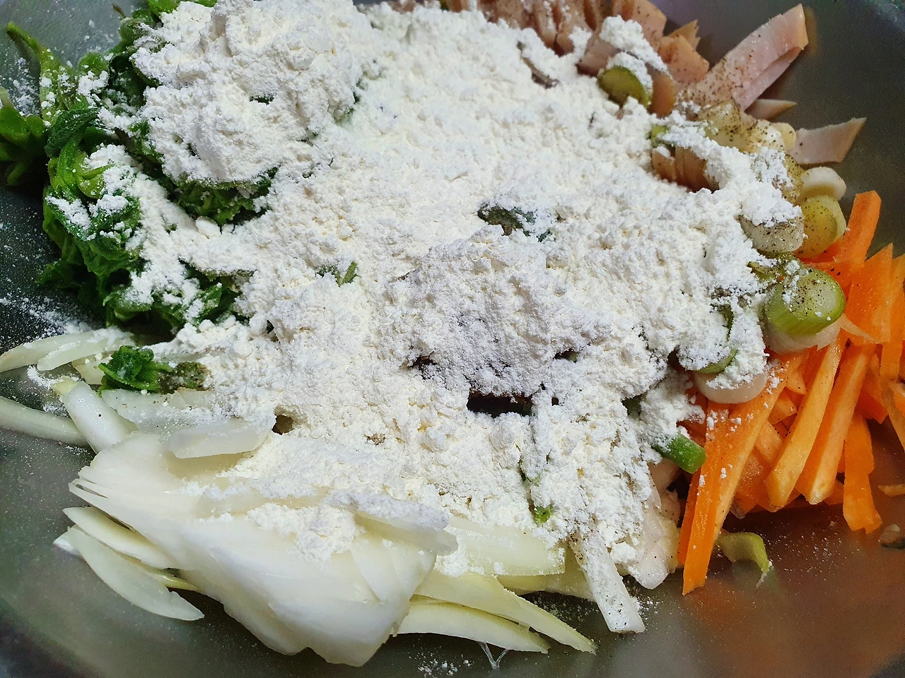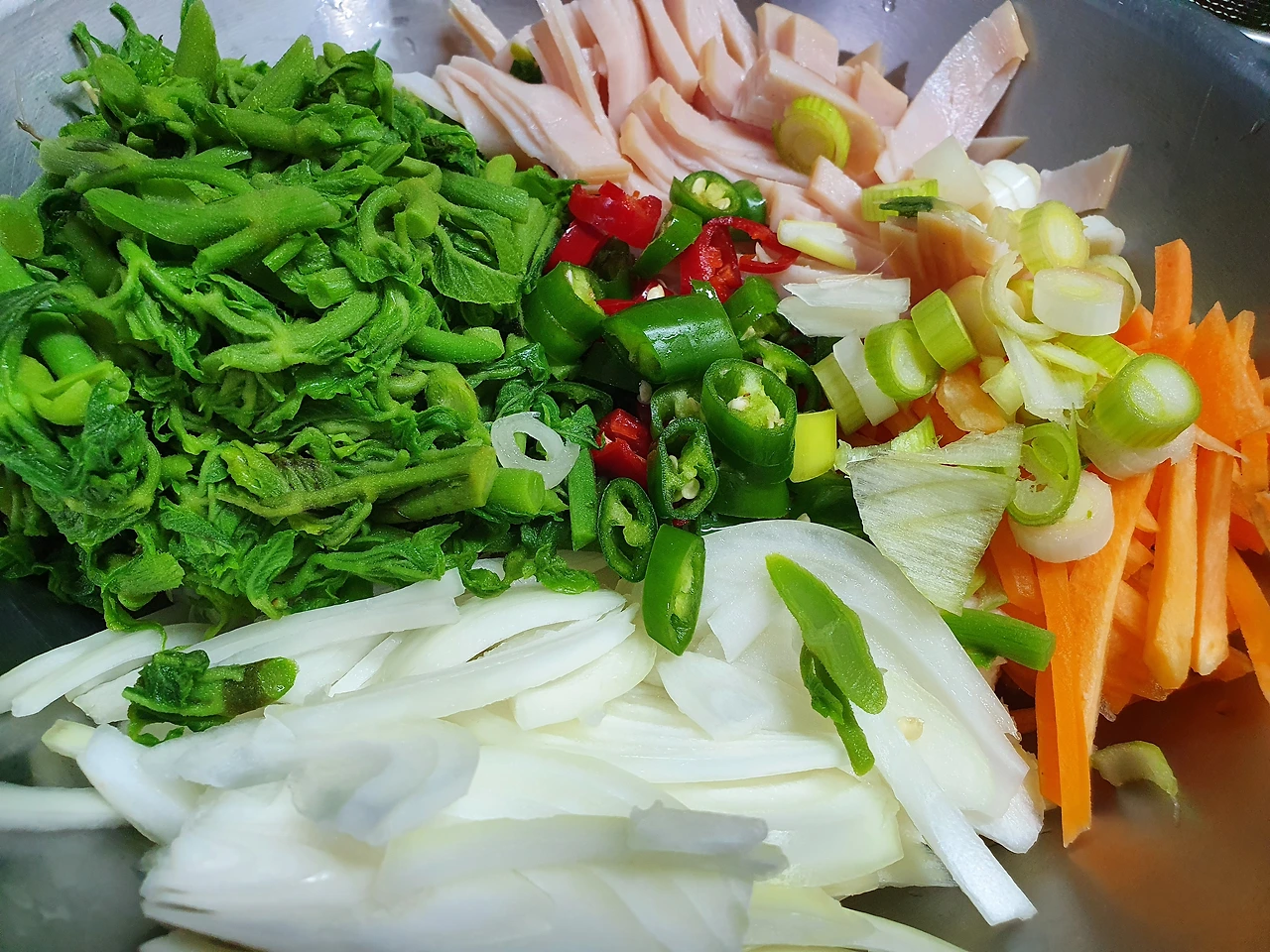 재료두릅-200g(손질 후)양파-1개당근-반개청양고추-2개홍고추-1개대파-1대부침가루-1컵터어키 햄 -선택계란-1개소금-1큰술식용유