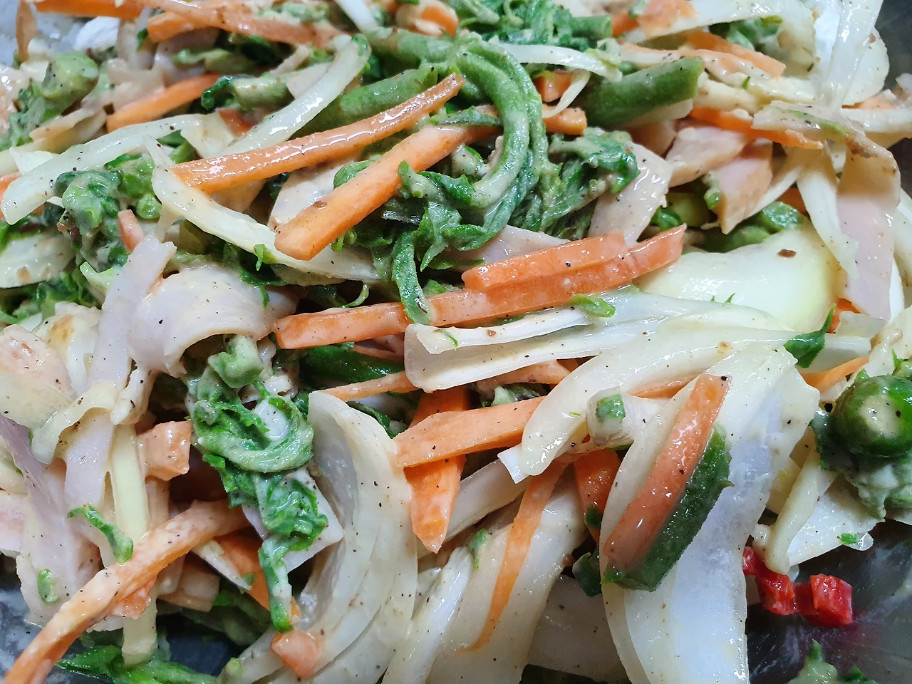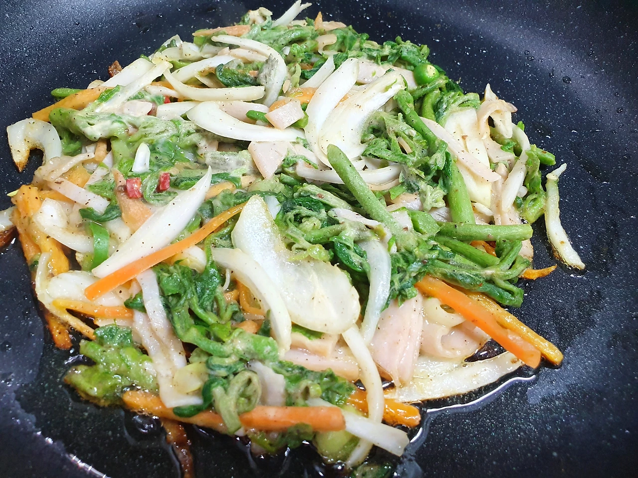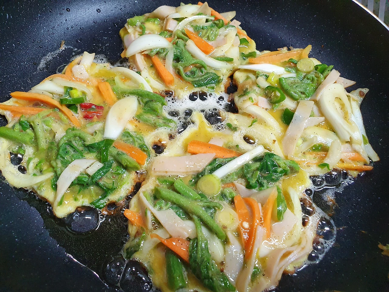 재료두릅-200g(손질 후)양파-1개당근-반개청양고추-2개홍고추-1개대파-1대부침가루-1컵터어키 햄 -선택계란-1개소금-1큰술식용유