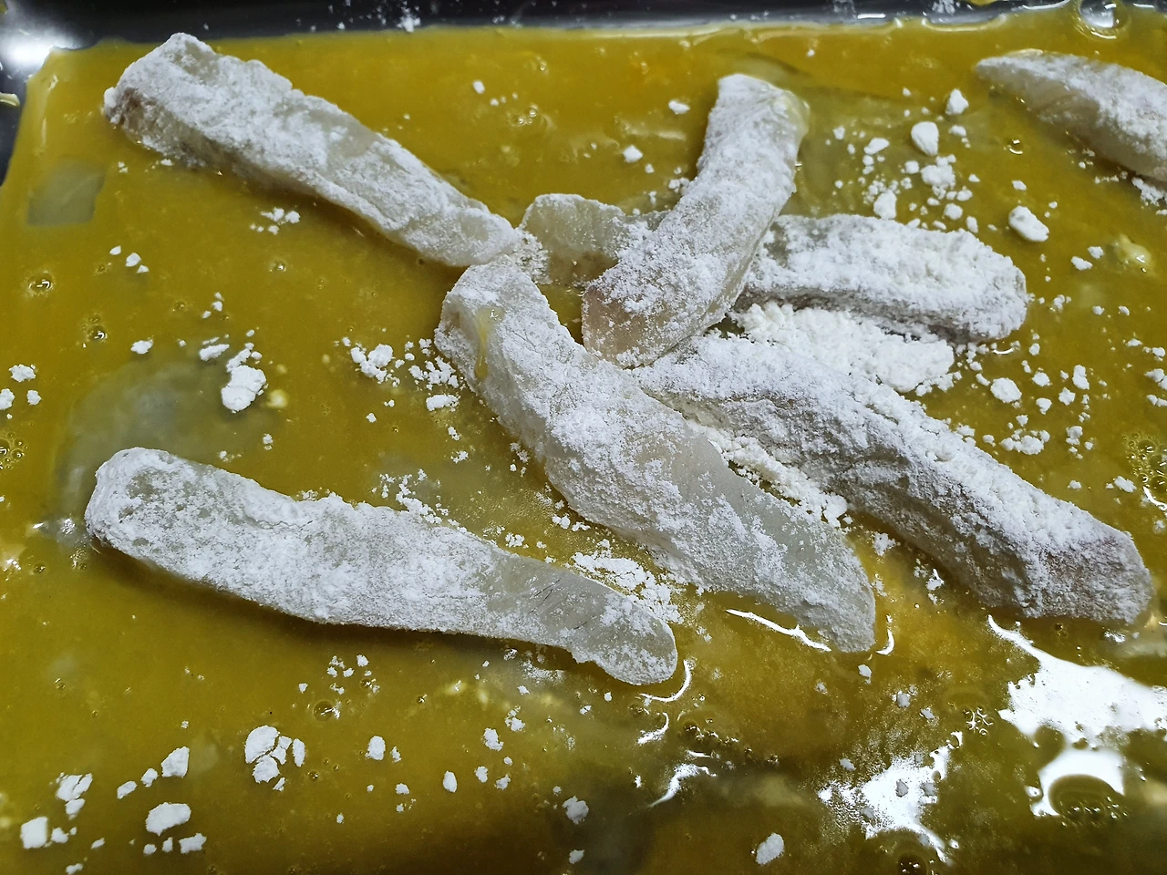 재료 광어회 - 먹다 남은 회 (15피스? 정도) 계란 -1개 튀김가루 -약간 빵가루 - 약간 식용유 소금, 후추