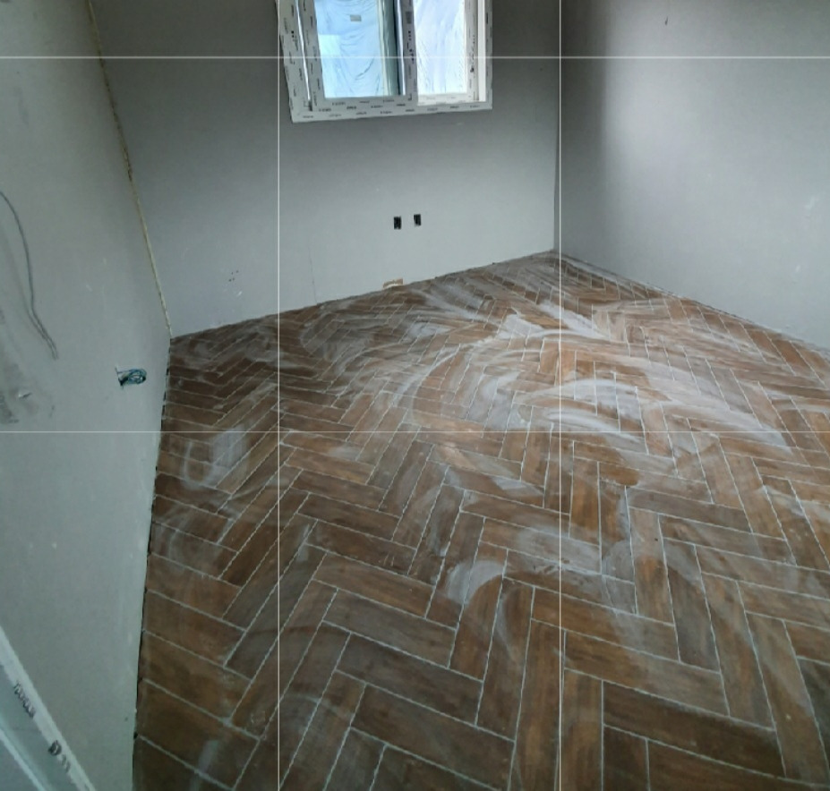 "우드 타일 헤링본 패턴은 줄눈 작업을 하고 나니 훨씬 더 타일이 돋보이네."