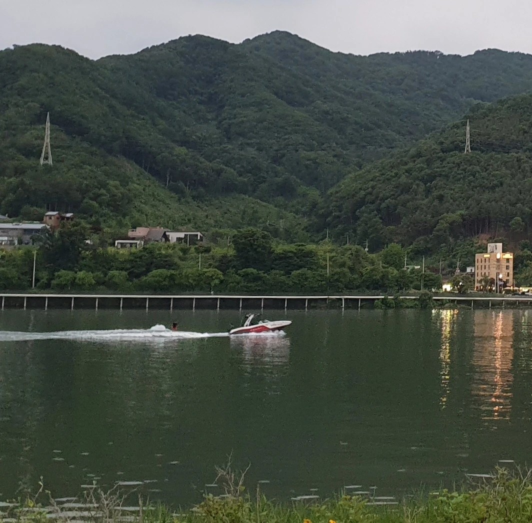 강 한가운데를 가로질러 시원하게 지나가는 보트와 웨이크 보딩을 하는 사람의 건강함은 보는 것만으로도 힐링이 된다.