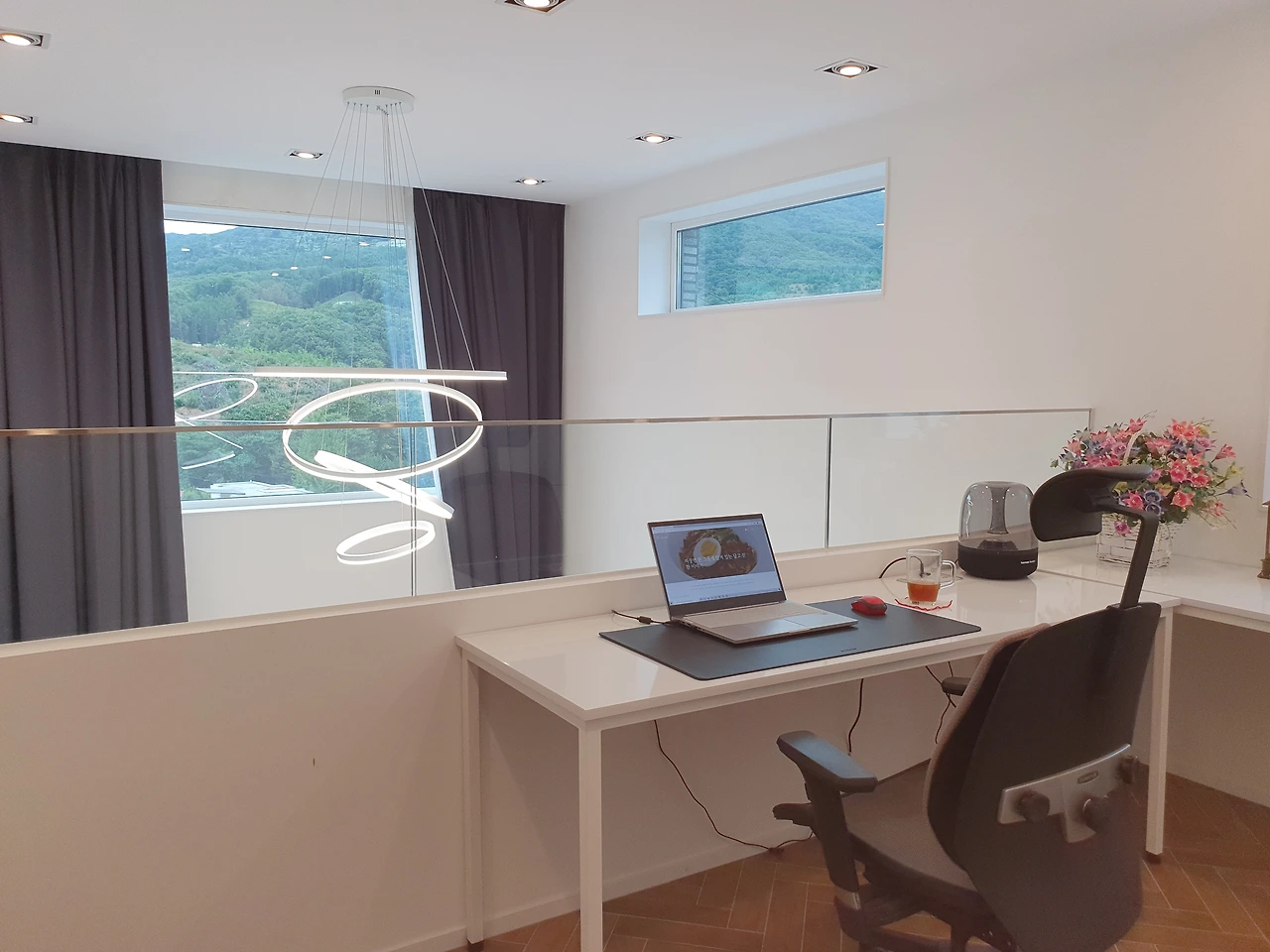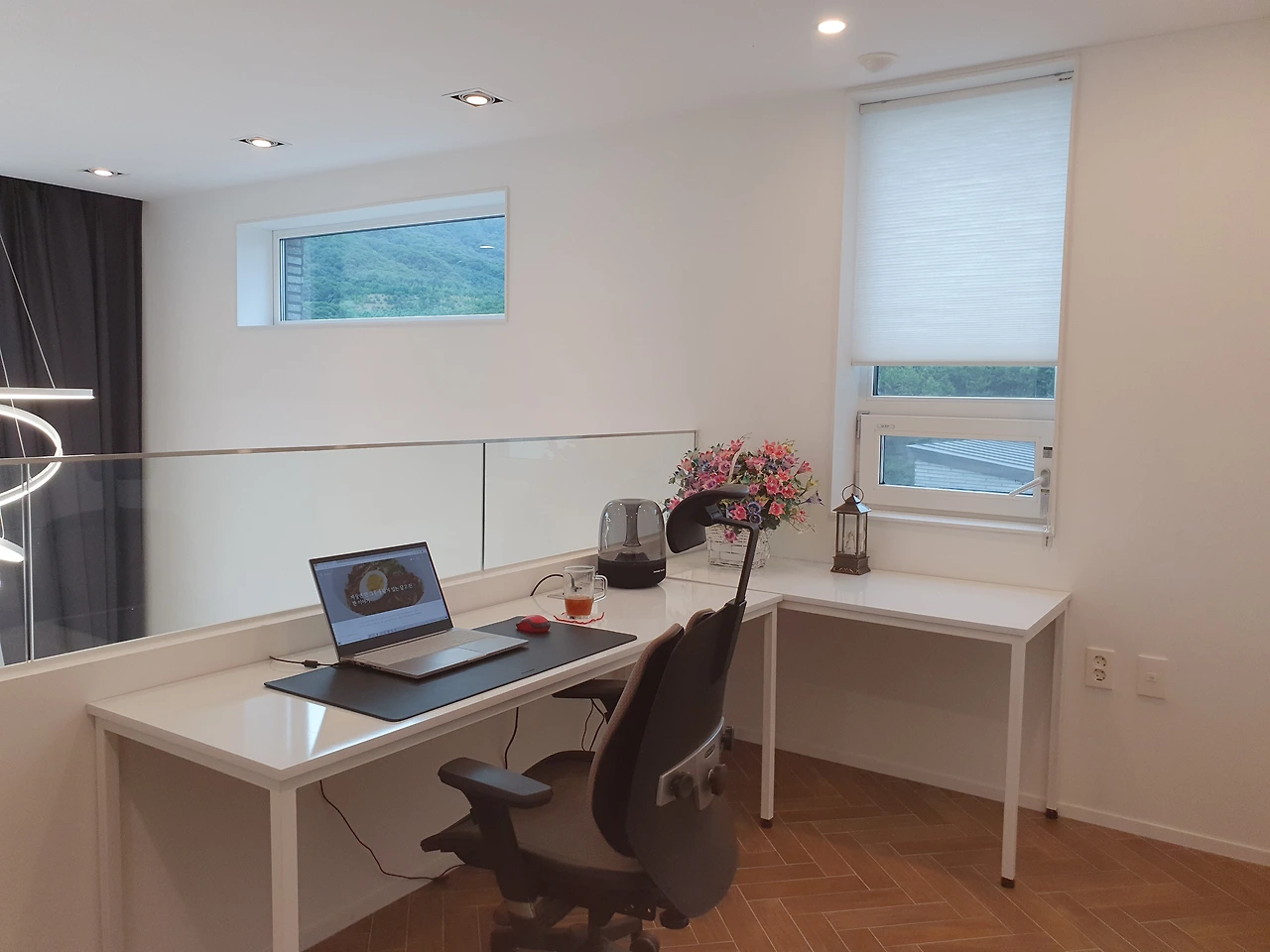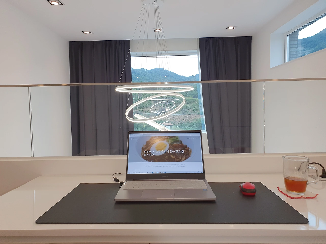 무심한 주인의 마음을 이해하는 듯 노트북 문을 여니 방긋 웃으며 반갑게 맞이해준다. 얼마나 답답하고 무료했을까 라는 마음에 노트북 얼굴을 살포시 매만져준다. 기다려준 녀석에게 보답을 하는 마음으로 새로 마련한 작업실 한가운데 턱 하고 놓아주니 녀석의 어깨가 천정에 척하고 달라붙는다.