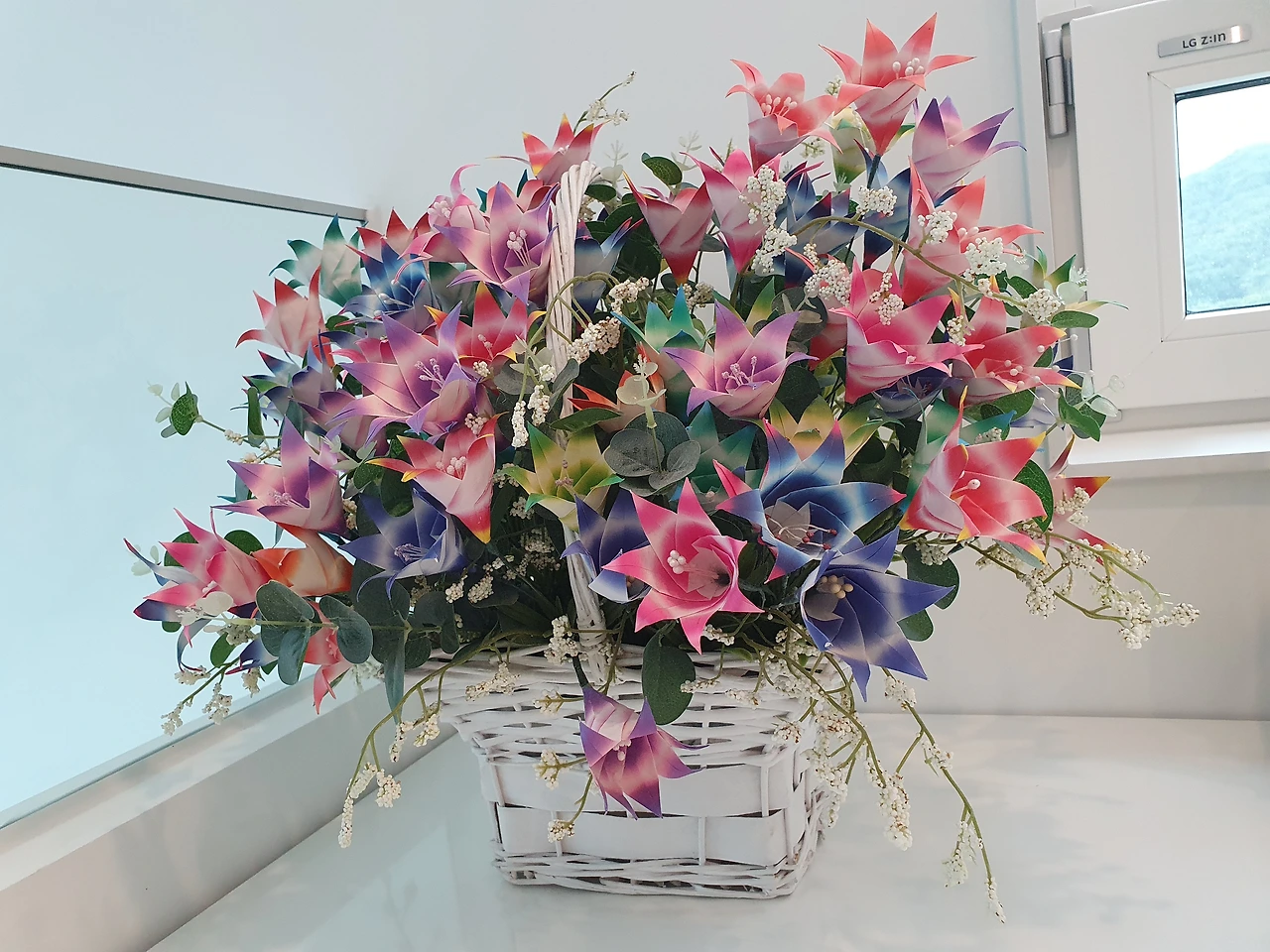 코너에 있는 하얀 바구니 안에서 방긋방긋 웃고 있는 꽃들이 화사함을 뽐낸다. 제자 중 한 명이 직장일을 마치고 늦은 밤 짬을 내어 자그마치 6개월 동안 정성을 다해 만들었다는 종이꽃이다.