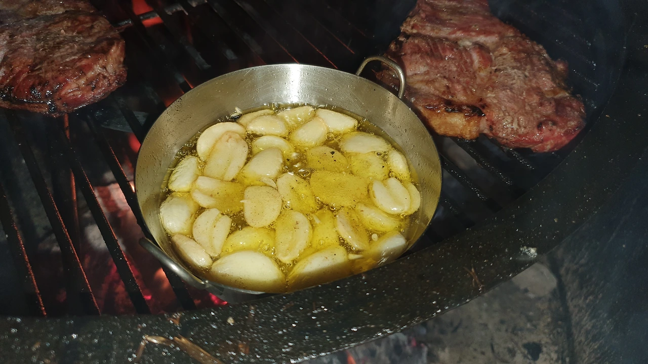 올리브유 듬뿍 담아 마늘을 구우면 풍미가 기가 막힌다.