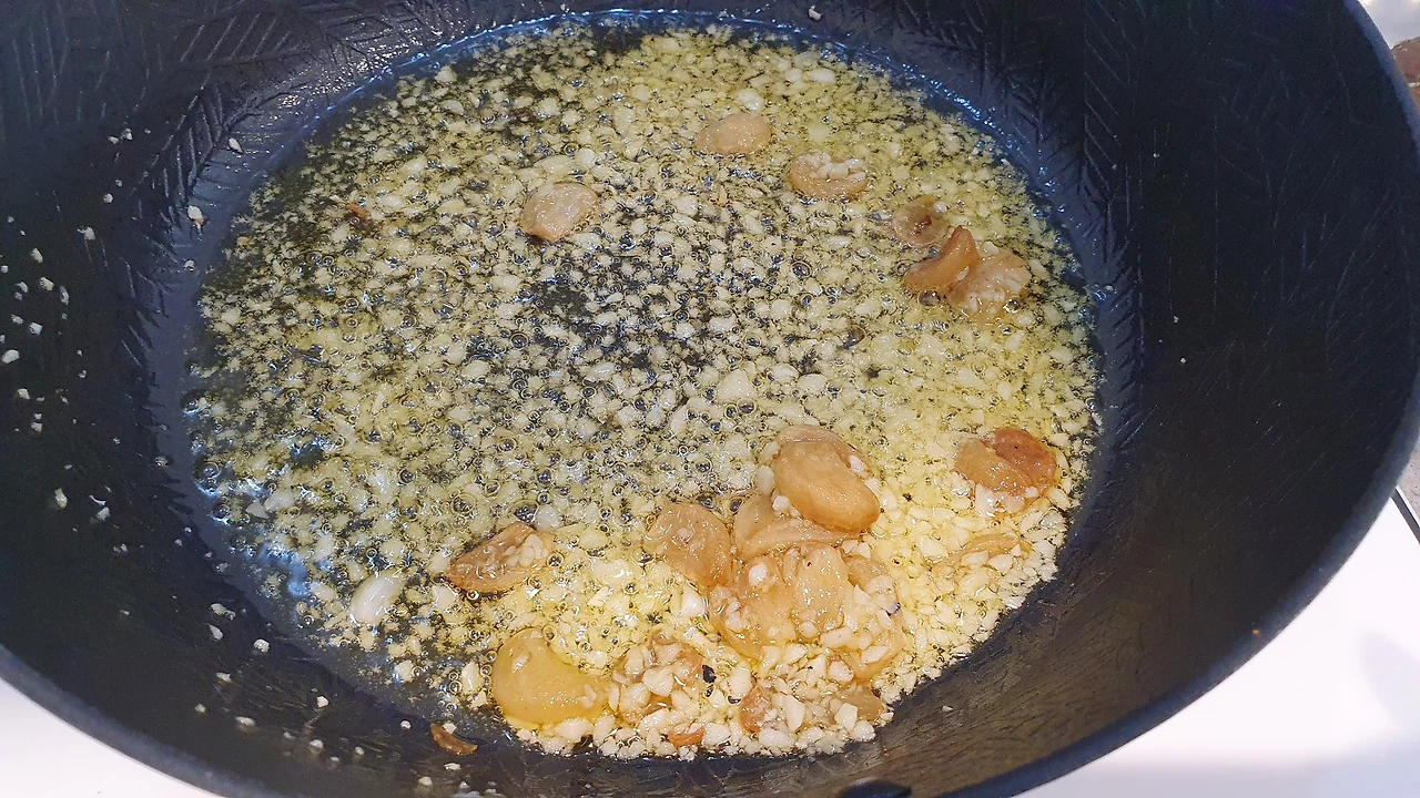 면을 삶는 동안 팬에 올리브유를 넉넉히 두르고 중 약불에서 통마늘을 볶다가 마늘이 노르스름 해지면 간 마늘도 따라 들어 갓!