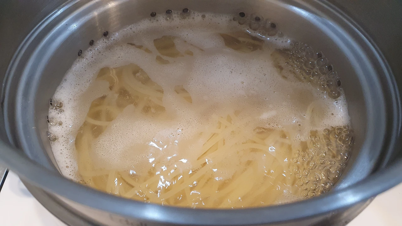 물이 끓으면 소금과 면을 넣고 8~10분 정도 면을 삶아준다.