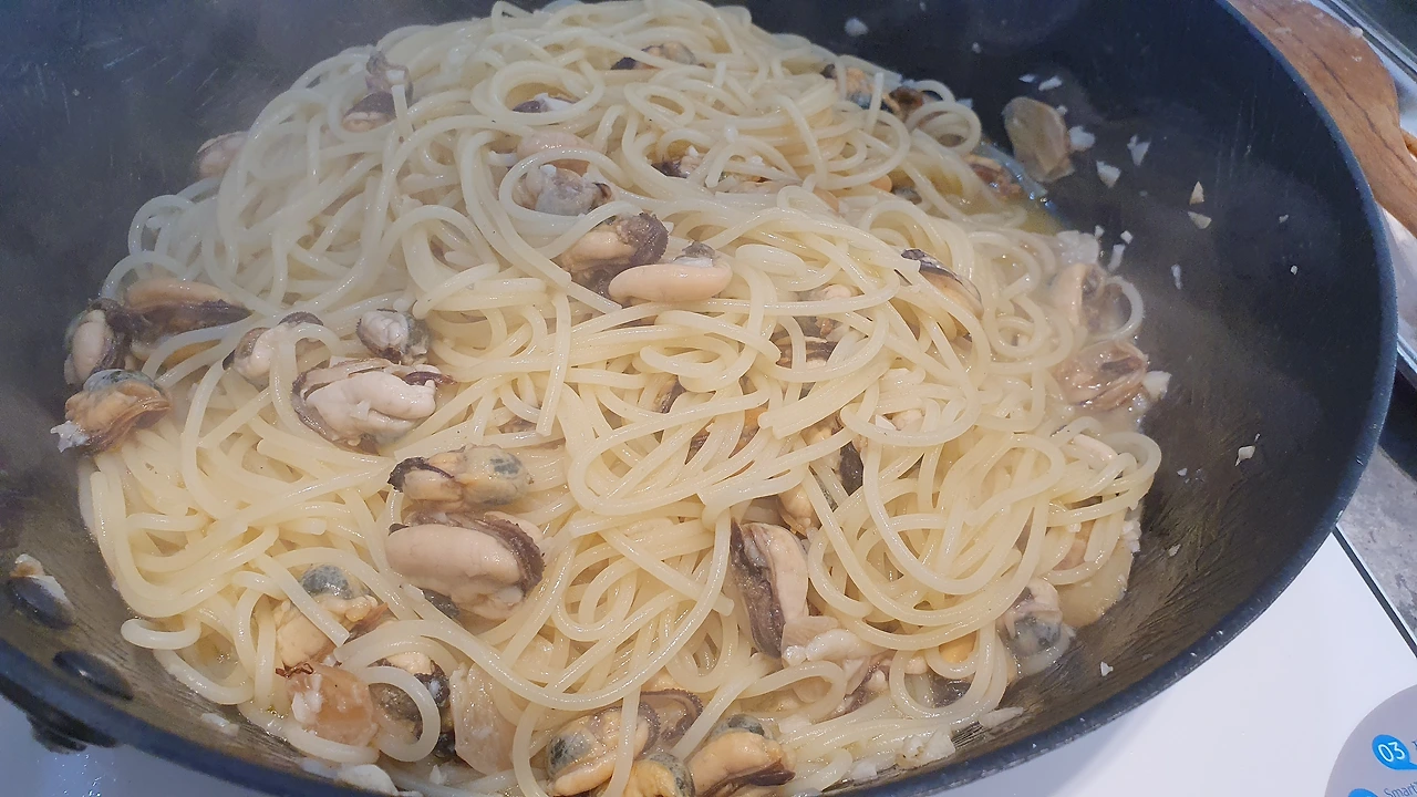 재료(2인 기준) 스파게티면- 200g 물- 2L 홍합살- 200g(맛술 2큰술) 올리브유 - 2/3 컵 통마늘- 10개 간 마늘- 4큰술 소금-1큰술 참치액젓-1큰술:선택 통후추 *면수- 2/3컵
