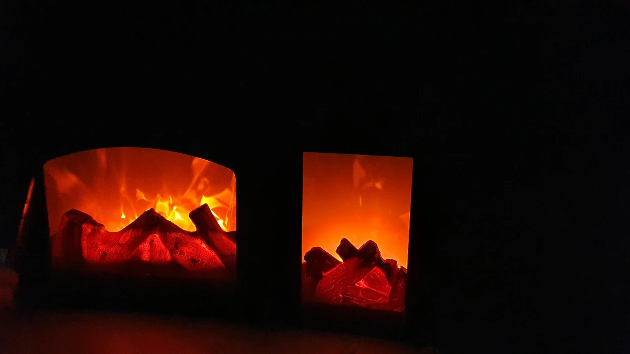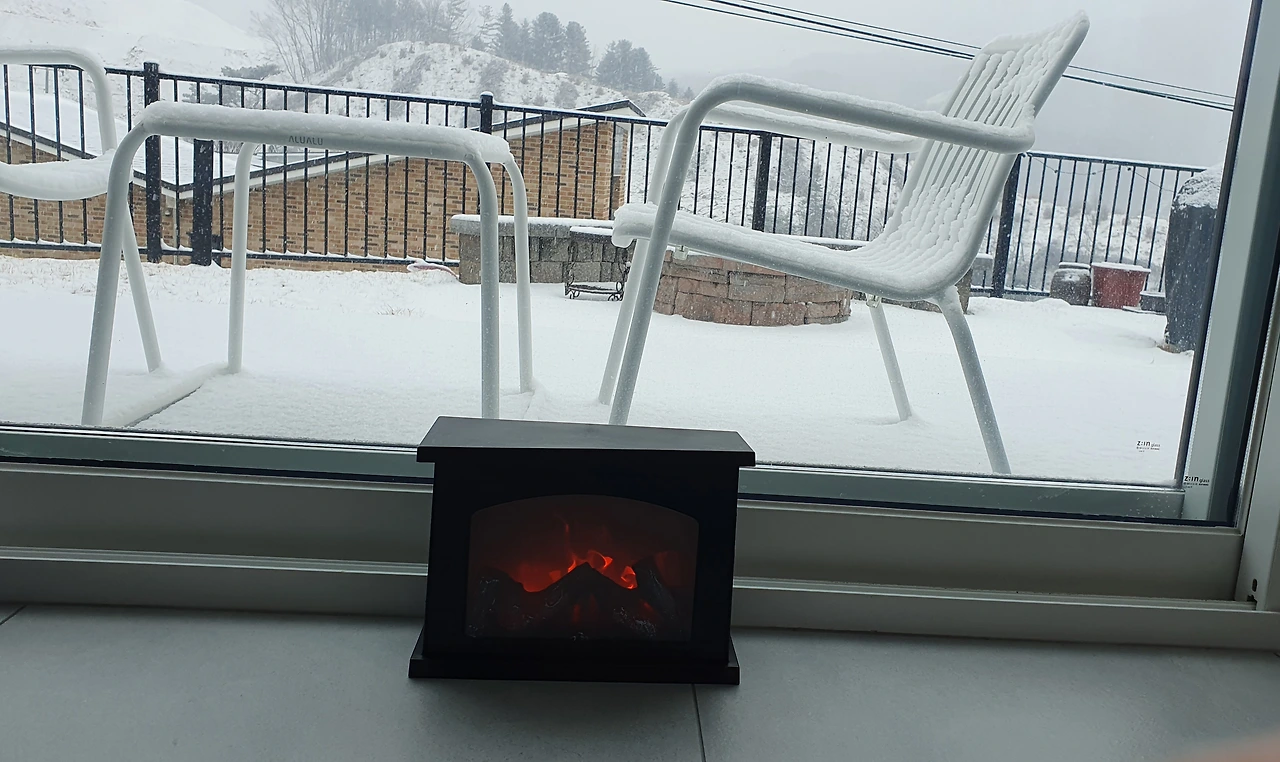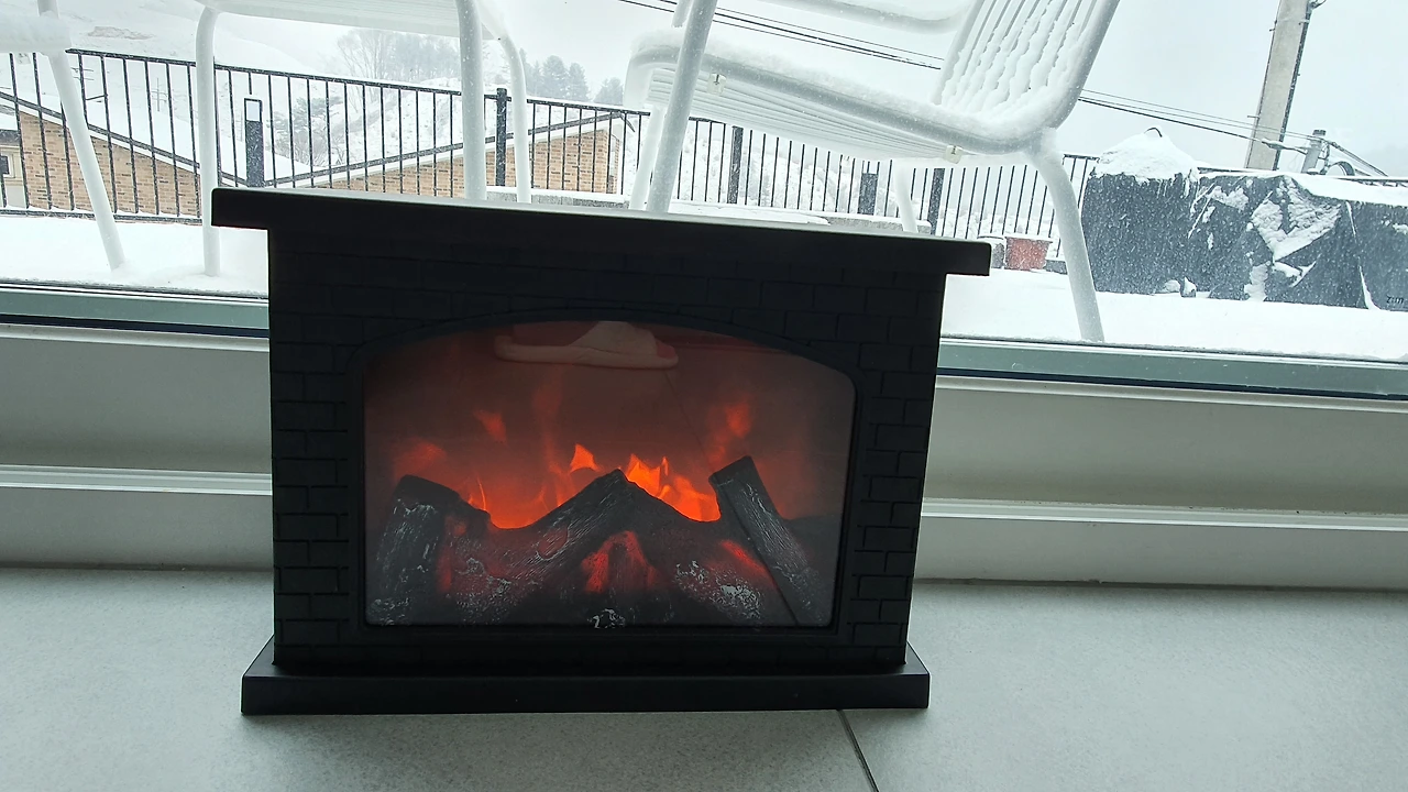 벽난로 램프를 TV 아래도 놓아보고 거실 창에도 놓아본다. 하얀 눈과 꽤 잘 어울린다.