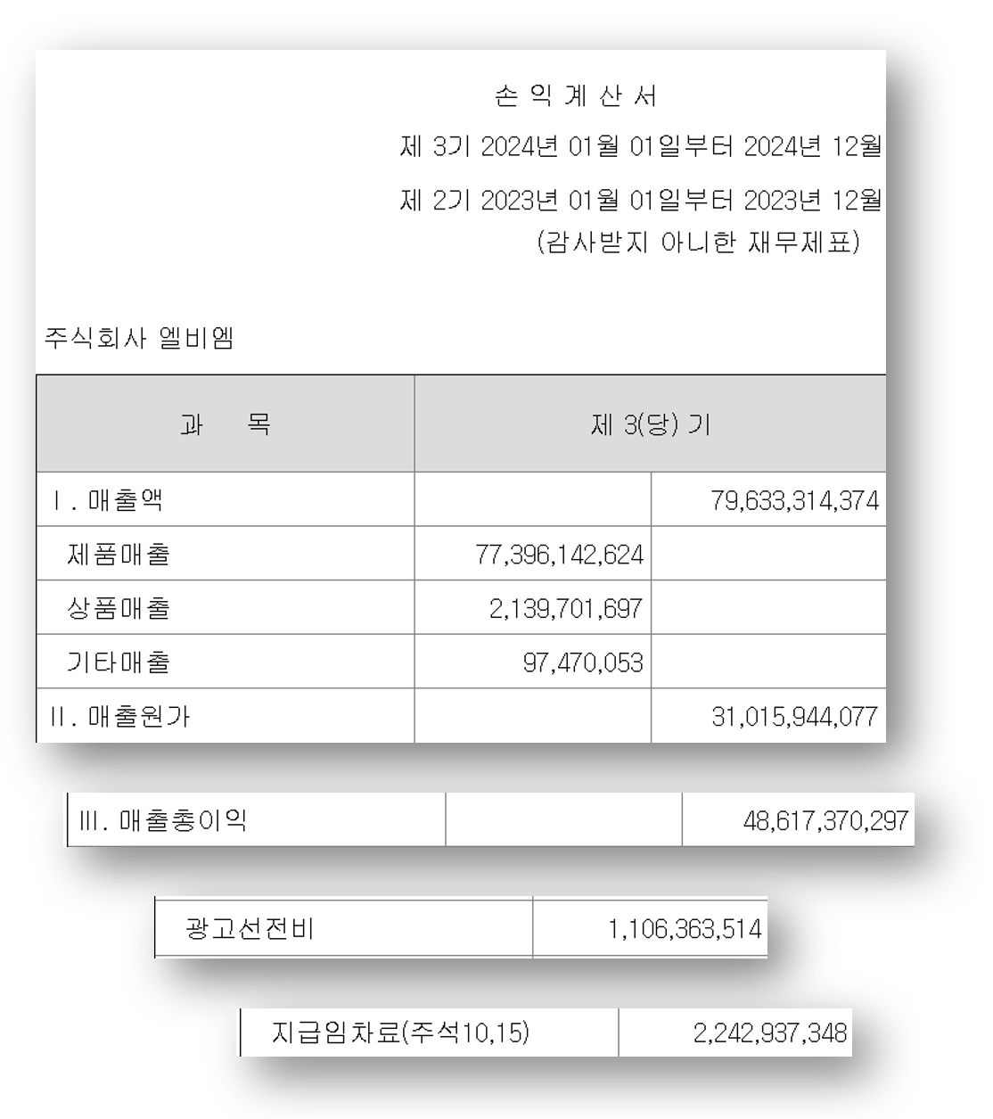 JKL파트너스와 같은 투자자가 LBM의 가치를 꿰뚫어 본 지점은 화려한 베이글 너머, 보이지 않는 곳에 있던 게 아니었을까. 바로 매출원가, 광고선전비, 그리고 지급임차료.