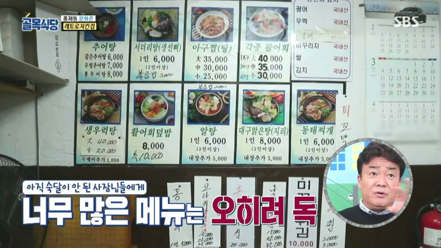 " 메뉴가 너무 많아유! 혼자서 저 많은 걸 어떻게 다해유! 저거 다 한다고 하더라도 시간이나, 재료는 또 어떻게 할꺼에유! 싱싱하지 않으면 결국 안 먹으러 온다구유! 추어탕 집에 추어탕 먹으로 오지, 회랑 아구찜 먹으러 오겠슈?! "