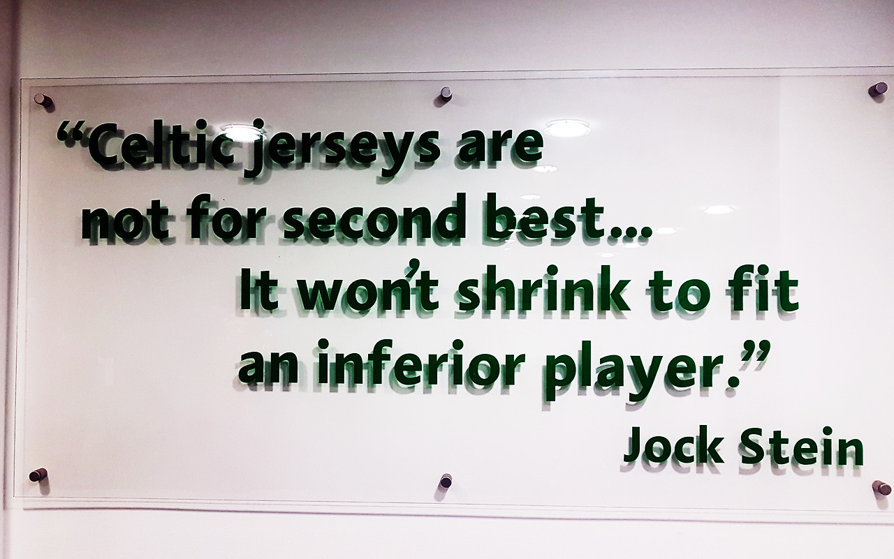 서론이 길었는데, 이 스타인 감독의 흔적을 좇고자 셀틱 파크를 찾았었다. 앞서 소개했던 트로피와 업적에 관한 흔적은 셀틱의 박물관에서 넘치듯 확인할 수 있다. 하지만 이미 충분히 설명한 만큼 여기서 맺겠다. 대신 셀틱 파크 곳곳에 남겨진 그의 메시지와 철학에 대해 소개하고자 한다.