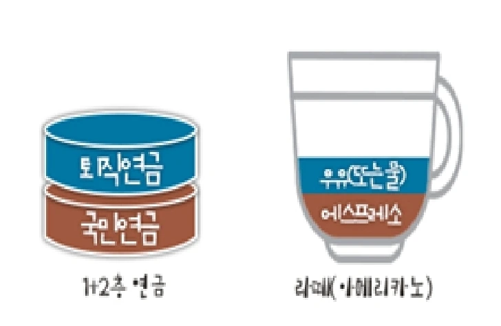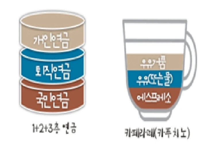 연금과 커피는 기본적으로 3층으로 구성된다. 1층은 국민연금과 에스프레소,2층은 퇴직연금과 물(또는 우유), 마지막 3층은개인연금과 우유 거품으로, 재미있는 연상(聯想)이다.