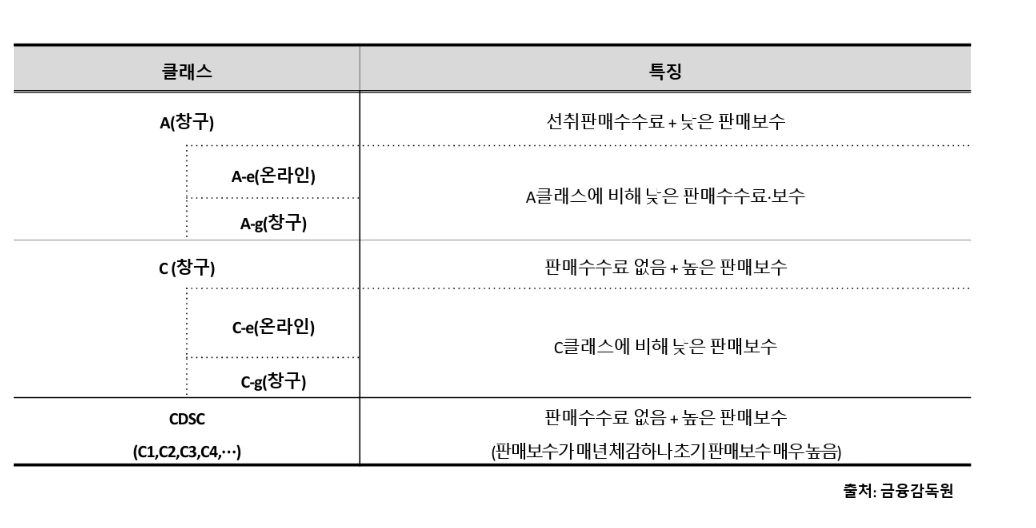 모든 펀드는 클래스(class)가 있다. 앞서 설명한 수수료 즉, ‘선취수수료’와 ‘보수’ 부과하는 방식이 달라진다. A클래스 펀드는 보통 1% 내외의 ‘선취수수료(1회성)’ 를 부과한다. 그러나 매년 부과되는 ‘보수’는 상대적으로 낮기 때문에 3년 정도 장기투자자에게 유리한 펀드라고 할 수 있다. 반면, C클래스는 ‘보수’가 A보다는 높지만 ‘선취수수료’를 부과하지 않기 때문에 1년 이하 단기 투자자에게 적합한 상품이다. 그리고 온라인에서만 가입 가능한 ‘E’ 또는’S’ 클래스의 경우는 ‘수수료’가 좀 더 저렴한 편이다. 결국 펀드를 선택할 때에는 본인의 투자기간과 가입경로에 펀드 클래스를 선택해야 한다.