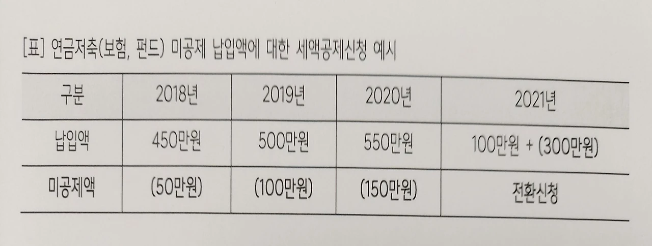 연금저축(계좌) 400만 원 한도를 초과해도 연말정산 세액공제가 가능하다. 무슨 뚱딴지같은 소리냐고 반문할 수 있겠다. 연금저축(계좌) 연간 세액공제 한도는 400만 원이다. 여기에 IRP 300만 원까지 합하면 연금계좌는 연간 700만 원까지 가능하고, 연간 1800만 원까지 불입이 가능하다. 그렇다면 연금저축(계좌) 경우 400만 원을 초과해서 납부하면 세액공제를 받지 못할 까? 정답은 아니다. 세액공제 한도를 초과해서 해당 연도 세액공제를 받지 못했지만, 다음 연도나 그 이후에 언제든지 세액공제를 받을 수 있다. 그래서 연금저축(계좌)에 반드시 400만 원까지만 한도를 맞출 필요는 없다.