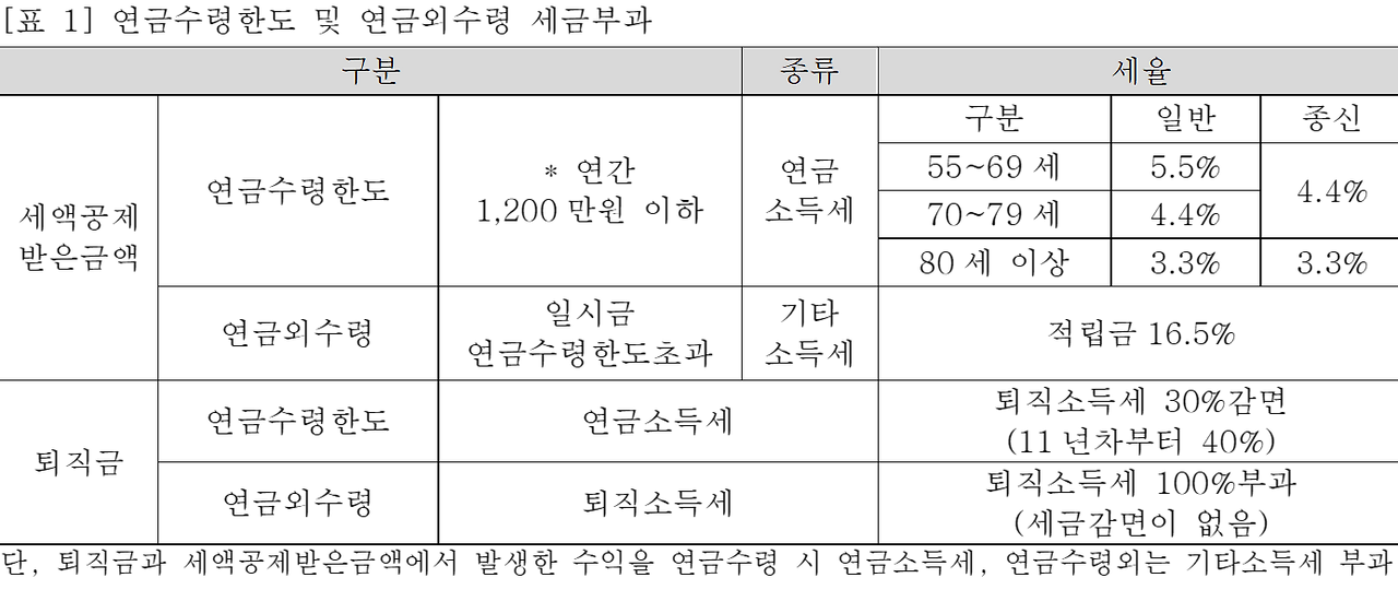 그런데 여기서 궁금한 것이 있다. 도대체 ‘연금’으로 받는다는 의미가 뭘까? 매월 나누어서 받으면 그게 연금이 아닐까,라고 생각하기 쉽지만 정답은 아니다. 세법에서는 연금수령 조건을 명확하게 규정하고 있다. 첫째,가입일 5년 이상 이어야 한다. 둘째, 55세 이후 받아야 한다. 셋째, 연금수령한도 내에서 받아야만 연금으로 인정하고 있다.퇴직금을 연금으로 받는 경우라면, 가입일 5년 경과 조건은 적용하지 않는다. 또 대부분 55세 이후 퇴직금을 받는 경우를 감안할 때 연금으로 받는다는 얘기는 ‘연금수령한도’라는 의미로 좁혀서 이해해도 무방하다. 여기서, 연금수령한도를 초과하면 연금 외 수령으로 정의하고 세금상 불이익을 준다. 다만 퇴직금의 경우 연금 외 수령한다고 해서 별도의 페널티가 있는 건 아니고, 세금 감면만 받지 못할 뿐이다.