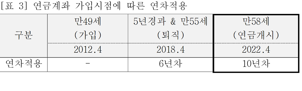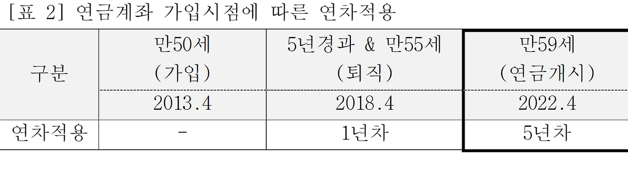 연금계좌는 2013년 3월 '이전'과 '이후’ 구분한다. ‘이전’은 연금수령 의무기간이 5년이었다. 그래서 5년간 연금을 나누어서 받아야 세금 혜택을 주었다. 그래서 ‘이전’에 가입한 사람은 분모에 연금수령 연차를 1년 차부터 시작하는 것이 아니고 6년 차부터 시작한다(11-6년 차=5년) 2013년에 3월 이전에 연금계좌를 가입했다면 연금 개시할 수 있는 조건이 되는 해가 1년 차가 아니고 6년 차가 되는 것이다.