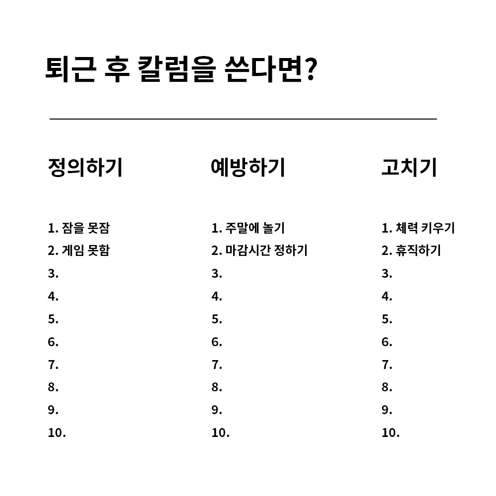 그다음에는 ‘고치기’로 마무리합니다. 생각한 최악의 상황이 발생한다면 그 피해를 줄이기 위해서 무엇을 하고 누구에게 도움을 청할지를 적습니다. 방법에 대해서 앞서 언급했던 글 쓰는 시간을 루틴화 할 수도 있고요. 만약에 회사 업무 때문에 피곤해서 칼럼을 못쓰는 경우 운동을 해서 체력을 키운다거나, 정 안되면 이직 및 휴직을 고려해 볼 수도 있겠네요.