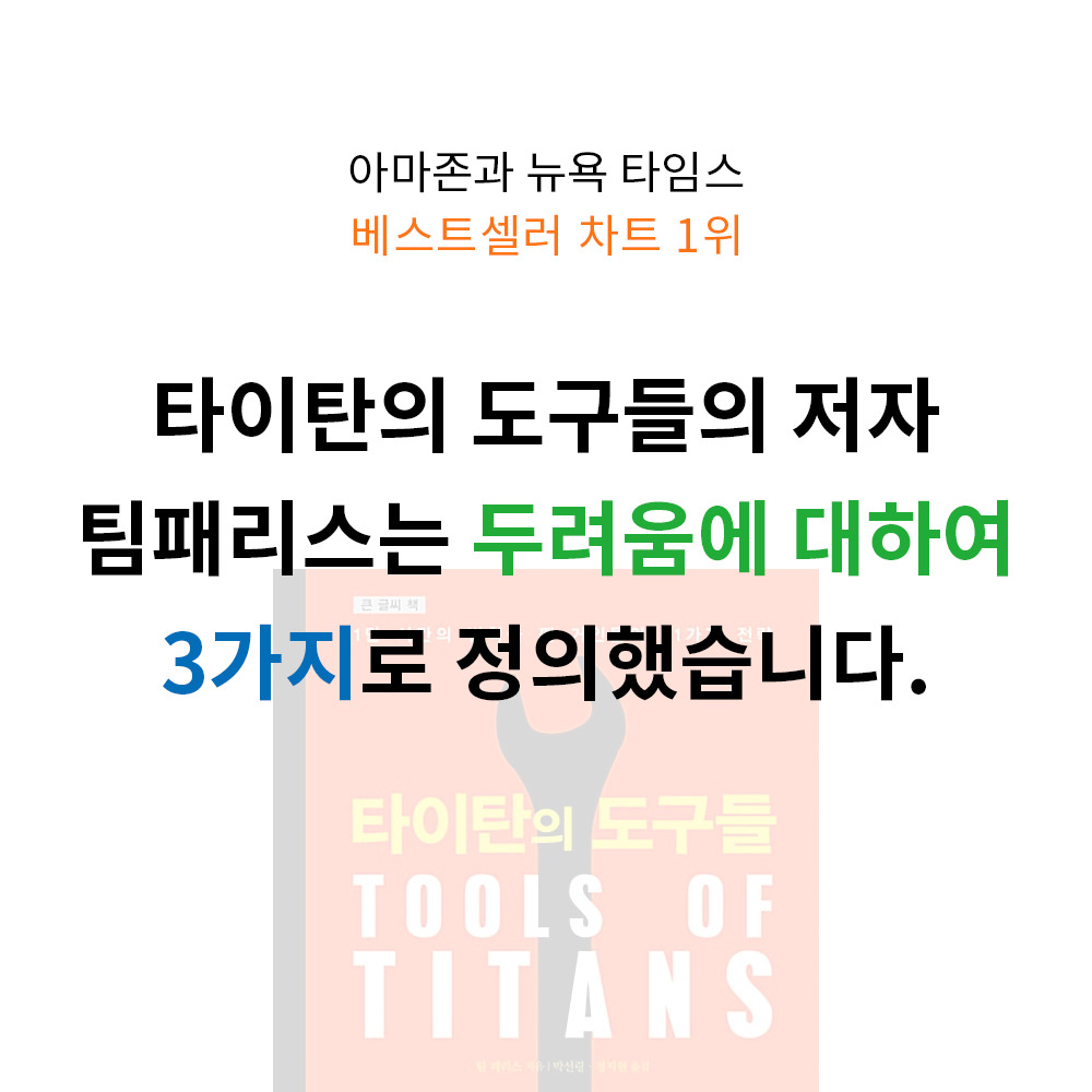 2017년 출간하여 즉시 아마존과 뉴욕 타임스 베스트셀러 차트 1위를 동시에 석권하며, 자기 계발 분야 스테디셀러 이자, 국내 독자들에게도 큰 사랑을 받은 타이탄의 도구들의 저자 팀패리스는 두려움에 대하여 세 가지 단계로 정의했습니다.